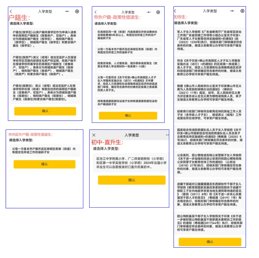 选择入学类型:新生须根据自身入学需求仅能选择一种类型申请入读,不得兼报多个类型,报名信息一经系统审核则无法变更入学类型,请各位家长认真确认好新生的入学类别与入学类型。
