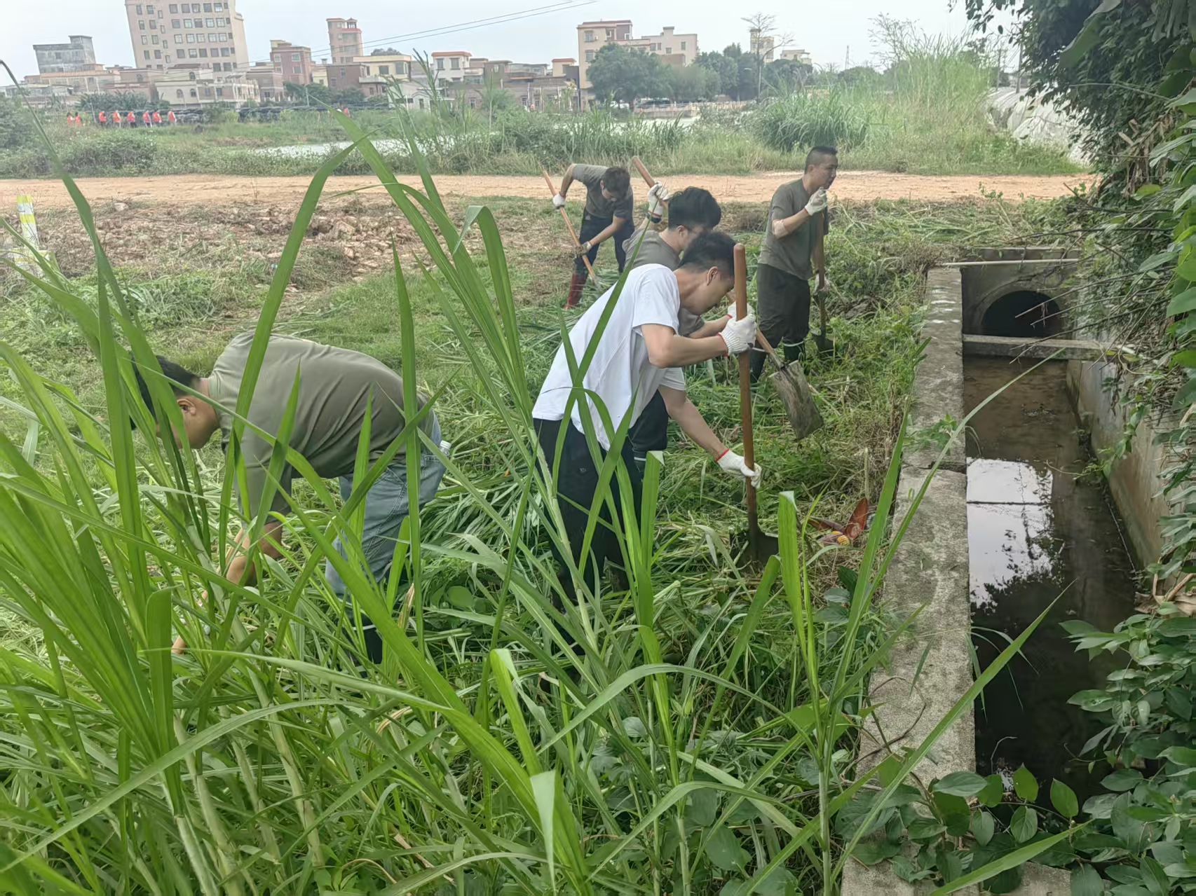 民兵队员积极铲除渠边杂草