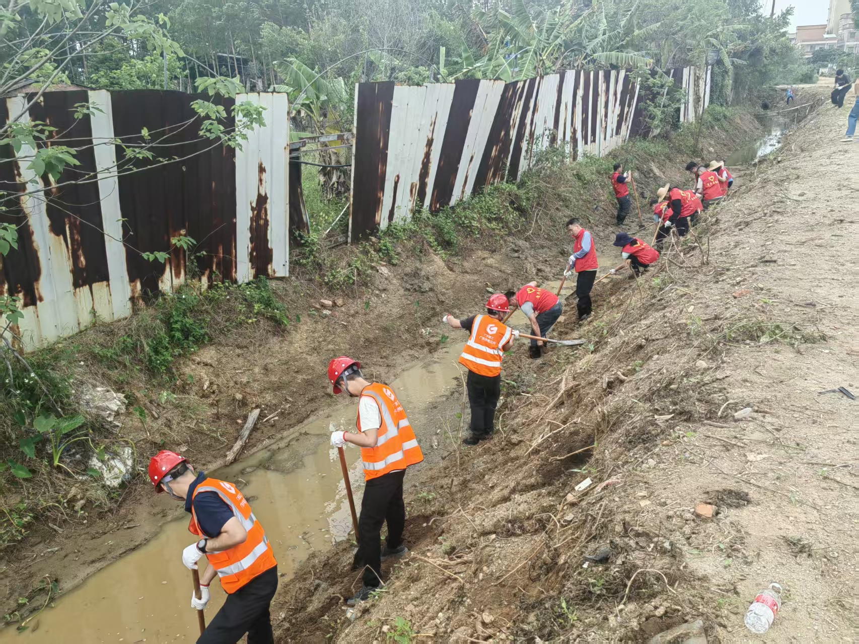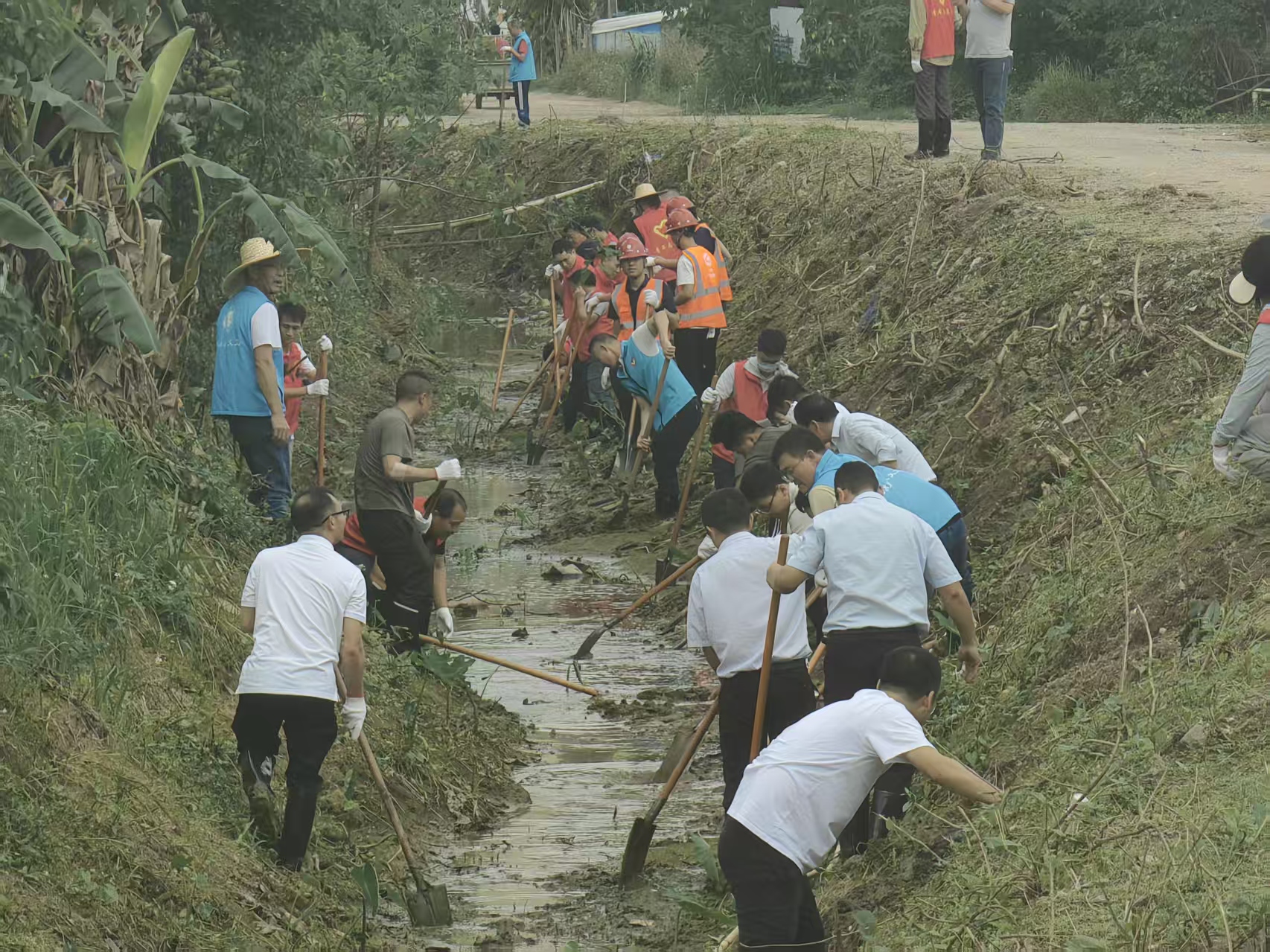 在南岸村委会张家村现场,来自省北江局、市水务局以及区镇两级水务、农业农村部门的工作人员,与党员群众、民兵队伍、专业清淤队等60余人参与活动。