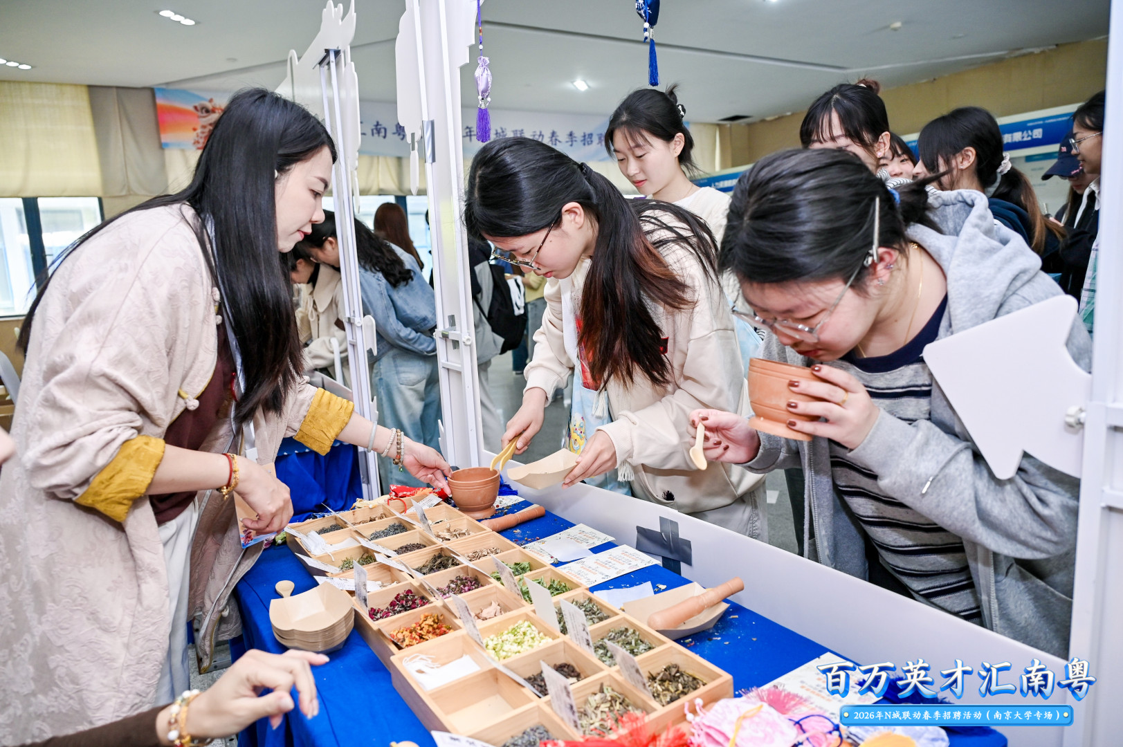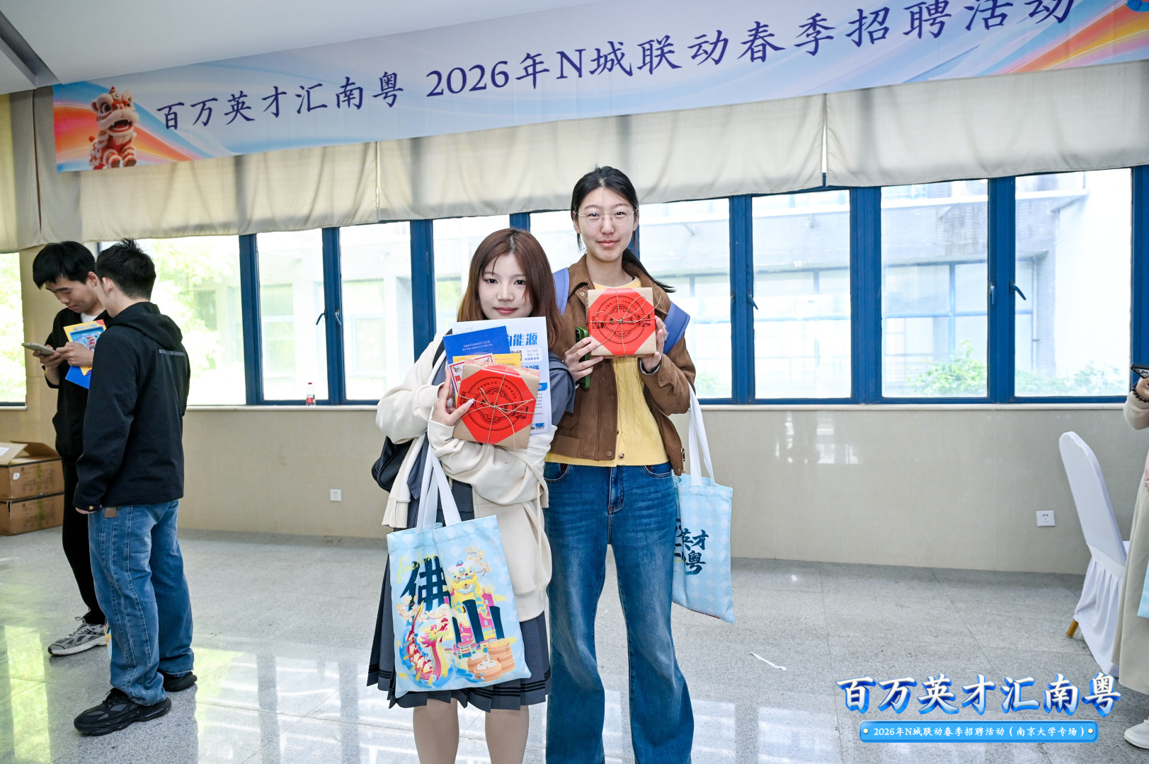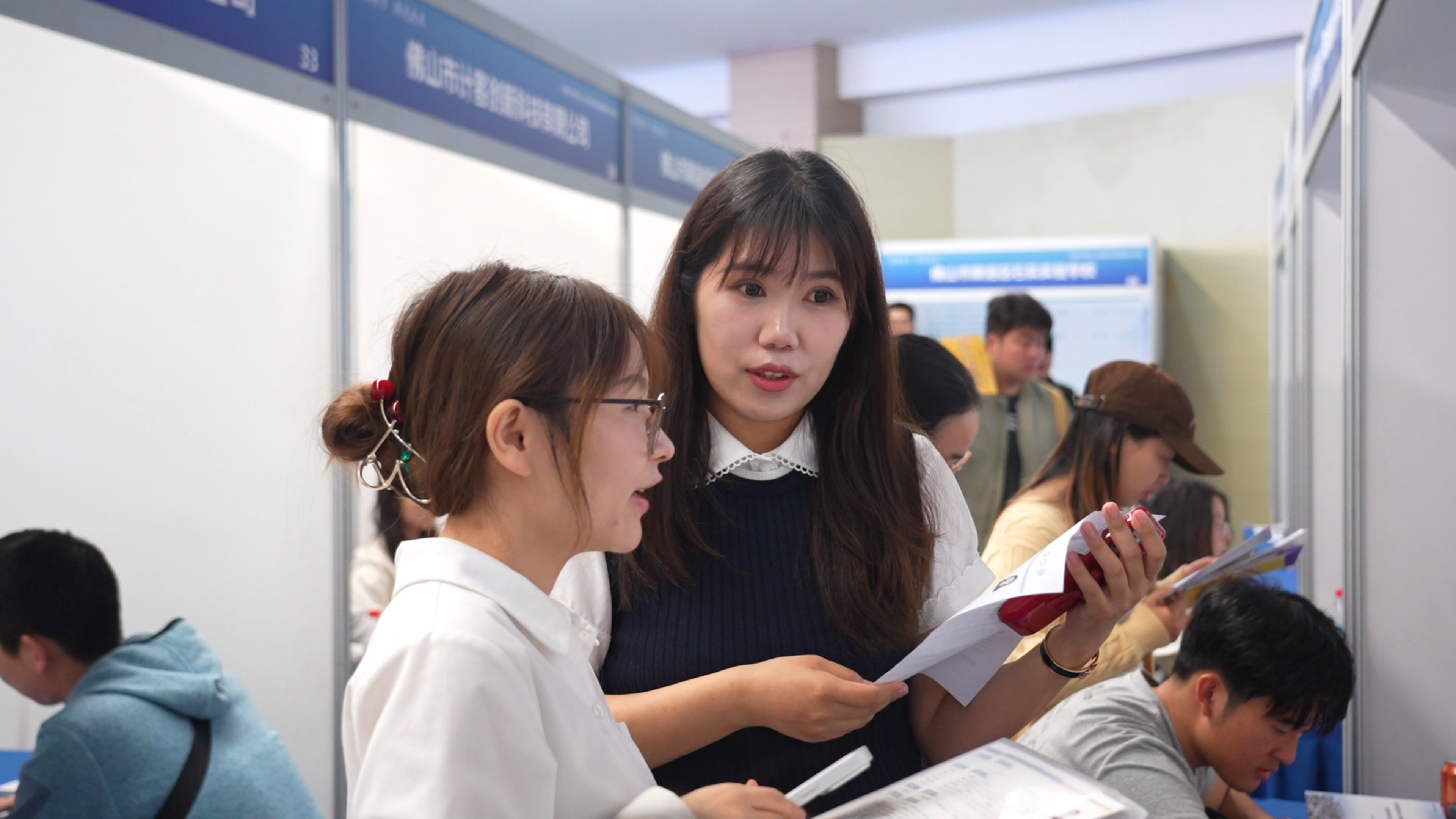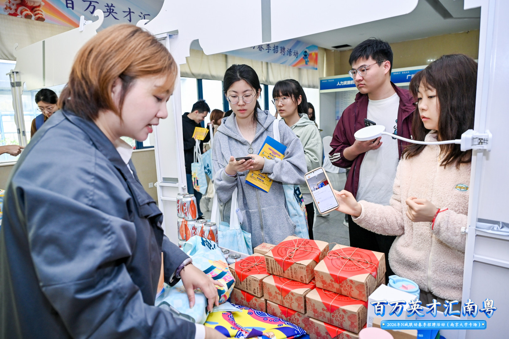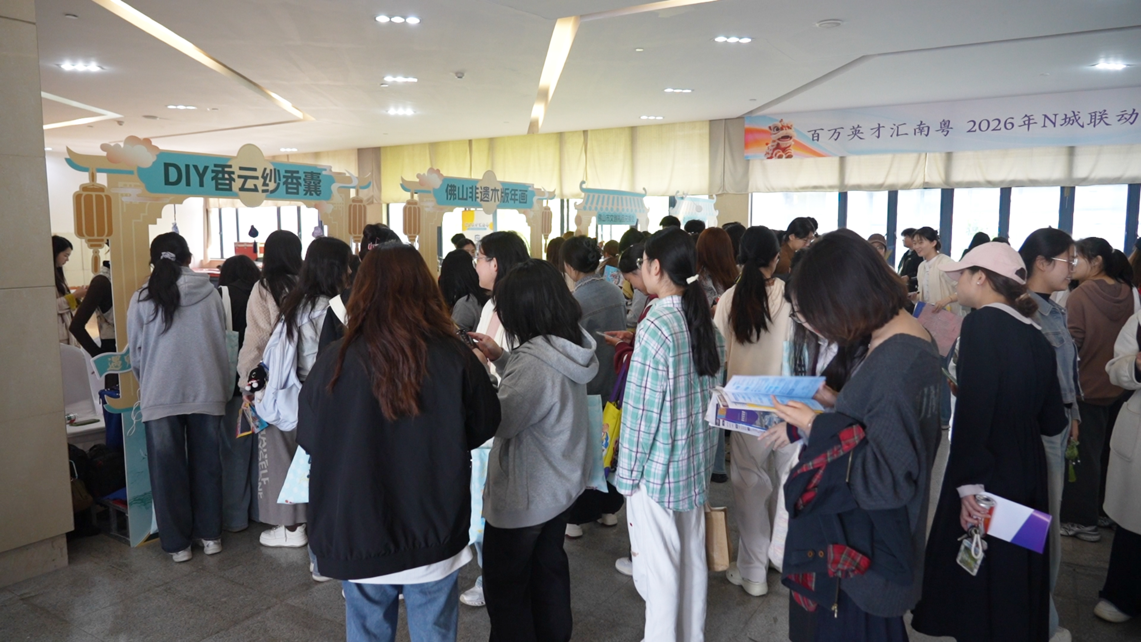 招聘现场,非遗展示区同样人气火爆。木版年画、香云纱手工香囊等岭南特色文化互动体验,吸引众多学子驻足。东南大学学生万岚岚感叹木版年画“非常好看、非常独特”,希望以后能去佛山旅游、亲身感受当地文化。万梦佳则表示,以前只在短视频里看过佛山文化,现场体验后印象更加深刻。