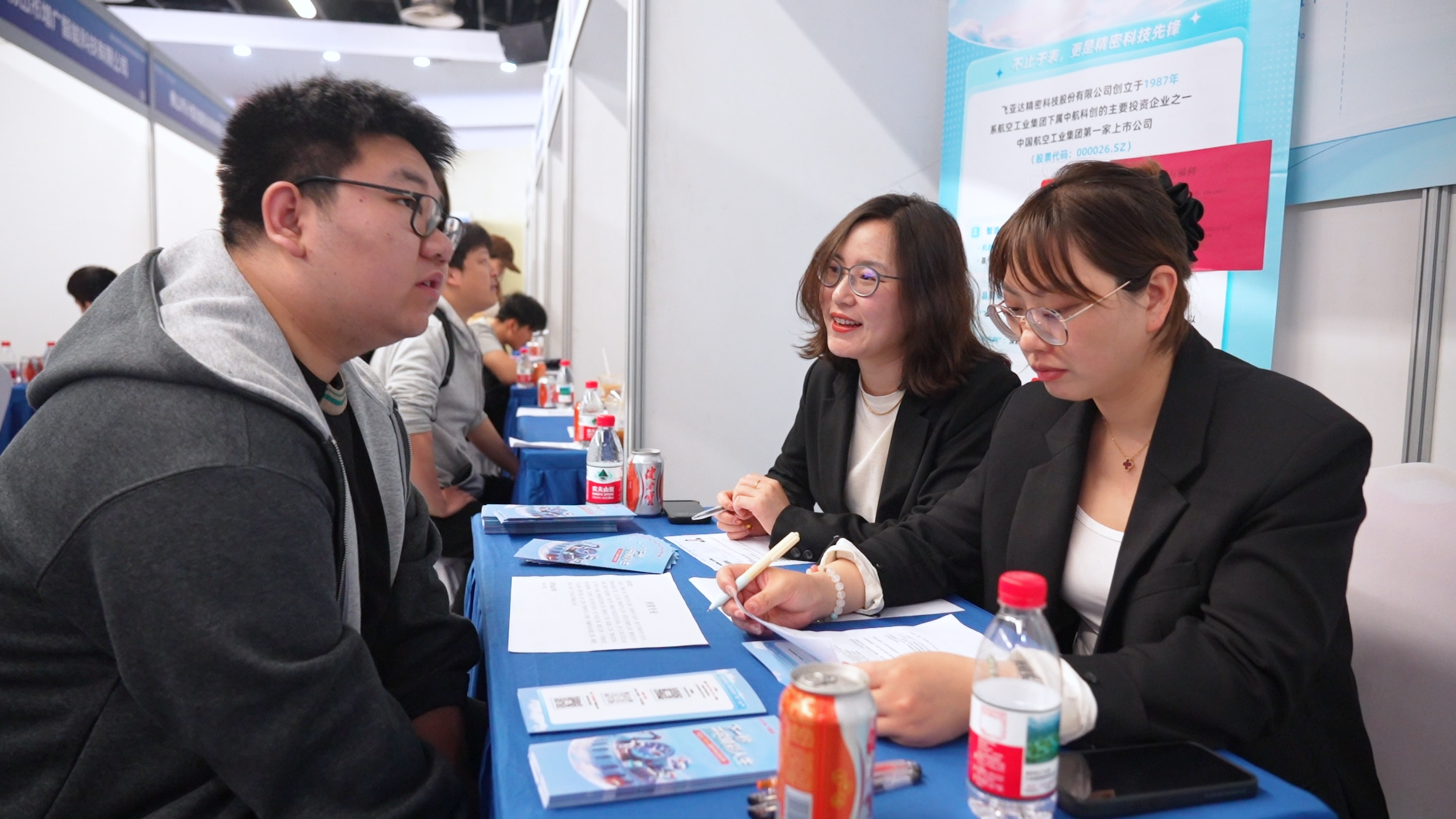 上午9时许,焦廷标馆交流区人头攒动。同学们手持简历,在各展位前驻足、咨询、递材料,有的展位前排起小长队。HR们耐心解答岗位要求、发展路径等问题。