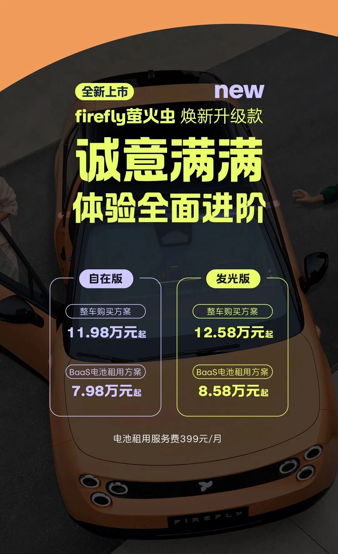 近日,新款firefly萤火虫上市,新车仍然推出自在款、发光款两款车型,售价为11.98万元、12.58万元,BasS电池租用方式为7.98万元、8.58万元。作为年度改款车型,新款firefly萤火虫在外观造型和内饰设计上与现款车型保持一致,新车最大变动在于动力,换装最大功率为120kW的驱动电机,相比现款提升了15kW。