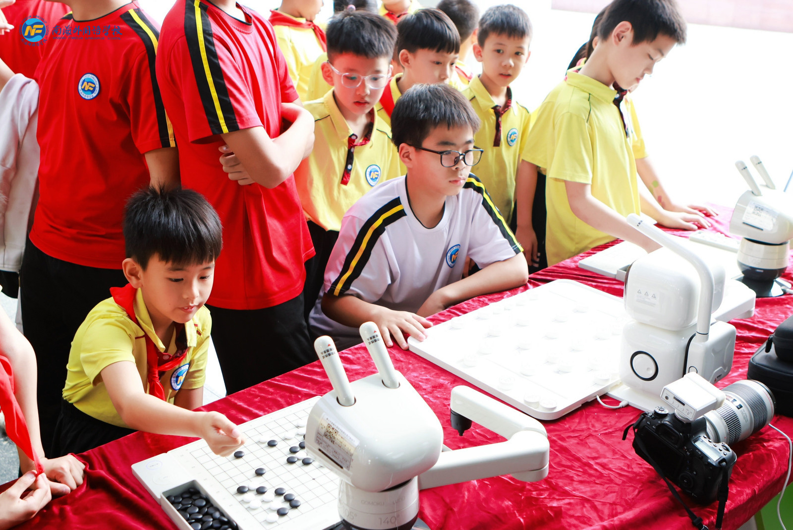 游园会现场设置了“小火山”爆发实验、AI下棋机器人对弈、剪纸工坊、诗词飞花令等互动项目,学生可与宇树机器人、机器狗亲密互动,探索人工智能的奥秘。