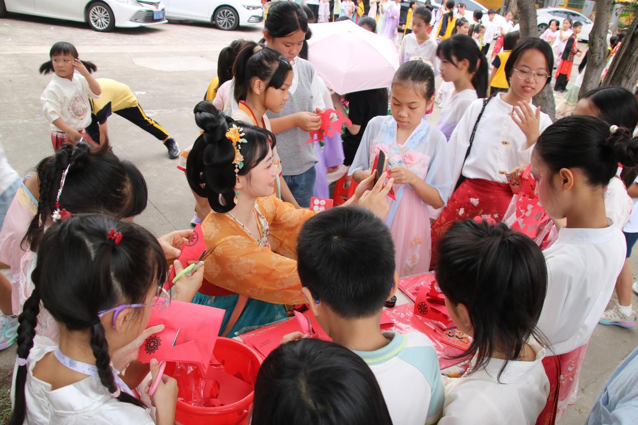 文艺汇演结束后,在刚刚种下老师、家长们认栽的银杏树的校园操场里,趣味十足的花朝游园活动正式开启,成为孩子们释放活力、感受传统文化的又一乐园。活动设置了12个以花为主题的特色摊位,每个摊位都融入了不同的传统文化元素,尽显古韵雅韵,有的摊位设置剪纸体验,孩子们跟着老师学习裁剪窗花,在一剪一折间感受传统剪纸艺术的魅力;有的摊位设置花艺DIY体验,孩子们亲手制作简易花束,感受动手的乐趣与花卉的美好;还有的摊位推出花朝传统小游戏,在欢声笑语中传递民俗文化,孩子们参与活动即可获得不同花神印章,集齐12枚花神章,便能兑换不同等级的奖品,极大地调动了孩子们的参与热情。
