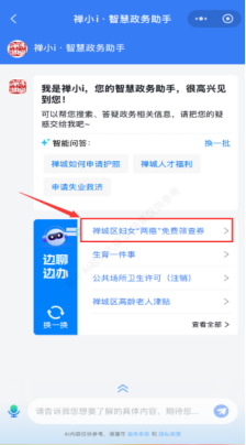 “全程只要1分钟,打开聊天对话框,简单操作几步筛查券就到手了,太方便了!”近日,家住禅城区的李女士通过“禅来办”微信小程序,与AI智慧政务助手“禅小i·边聊边办”进行了一番“对话”,顺利申领到了2026年禅城区妇女“两癌”免费筛查券。