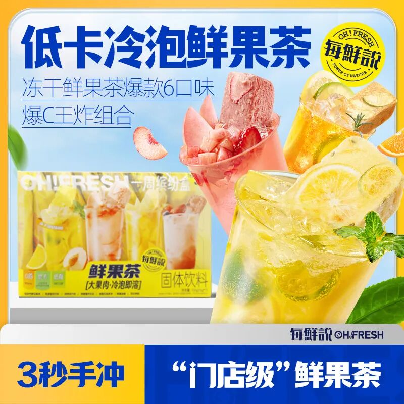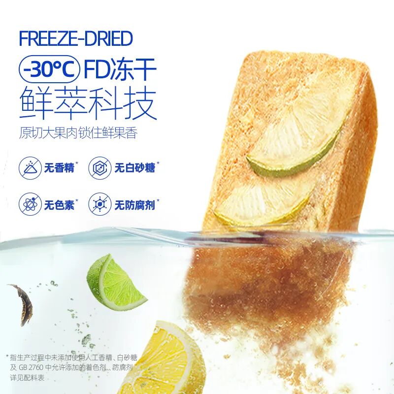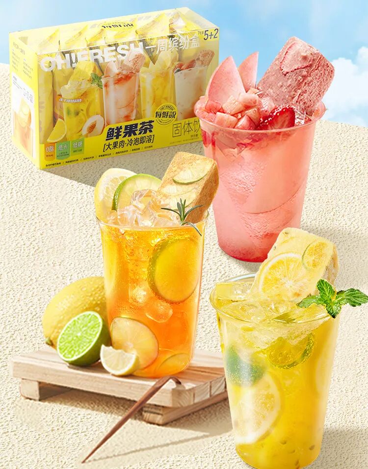 采用FD鲜萃冻干科技,-30℃瞬间锁鲜,保留水果维C营养,茶汤果味更浓,复刻奶茶店同款茶饮!