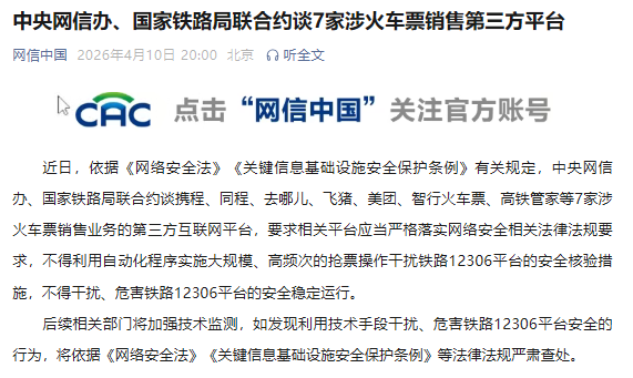 近日,依据《网络安全法》《关键信息基础设施安全保护条例》有关规定,中央网信办、国家铁路局联合约谈携程、同程、去哪儿、飞猪、美团、智行火车票、高铁管家等7家涉火车票销售业务的第三方互联网平台,要求相关平台应当严格落实网络安全相关法律法规要求,不得利用自动化程序实施大规模、高频次的抢票操作干扰铁路12306平台的安全核验措施,不得干扰、危害铁路12306平台的安全稳定运行。