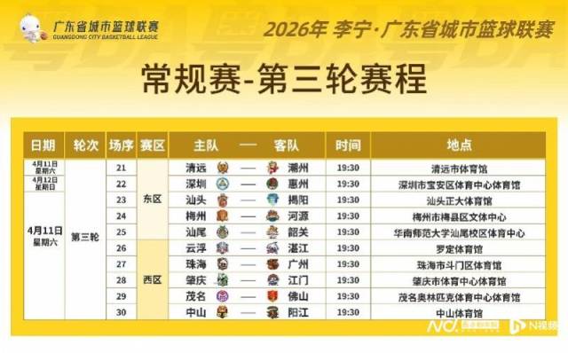 经过清明假期休赛调整,2026年广东省城市篮球联赛(粤BA)常规赛第三轮赛事即将在本周末再次打响,本轮赛事作为常规赛中期关键节点,除了十冠王东莞队轮空外,东西区20支队伍都将全力出击,争夺积分排名主动权。