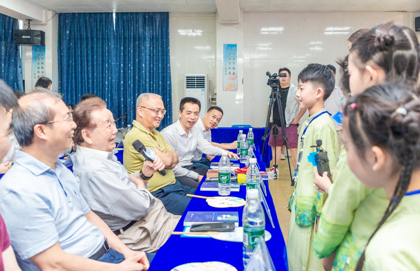 他勉励孩子们珍惜当下的美好时光,刻苦钻研、学好本领,无论将来走到哪里,都要牢记自己是中国人,主动扛起责任,为家乡发展、为祖国强盛贡献力量。“为家乡做事,你我不去做,谁去做呢?”一句朴素而有力的话语,直击人心,深深打动了在场的每一位师生与嘉宾。演讲结束后,小帆船文学社的小记者们踊跃提问,围绕“小时候在容桂玩什么游戏”“想家时会不会吃双皮奶”等童趣问题与吴国宝互动,吴国宝耐心细致地逐一解答,现场笑声阵阵、温情满满。活动最后,全体人员起立,与吴国宝共同合唱歌曲,用明亮的歌声传递“点亮自己、温暖他人”的美好期许,将活动氛围推向高潮。