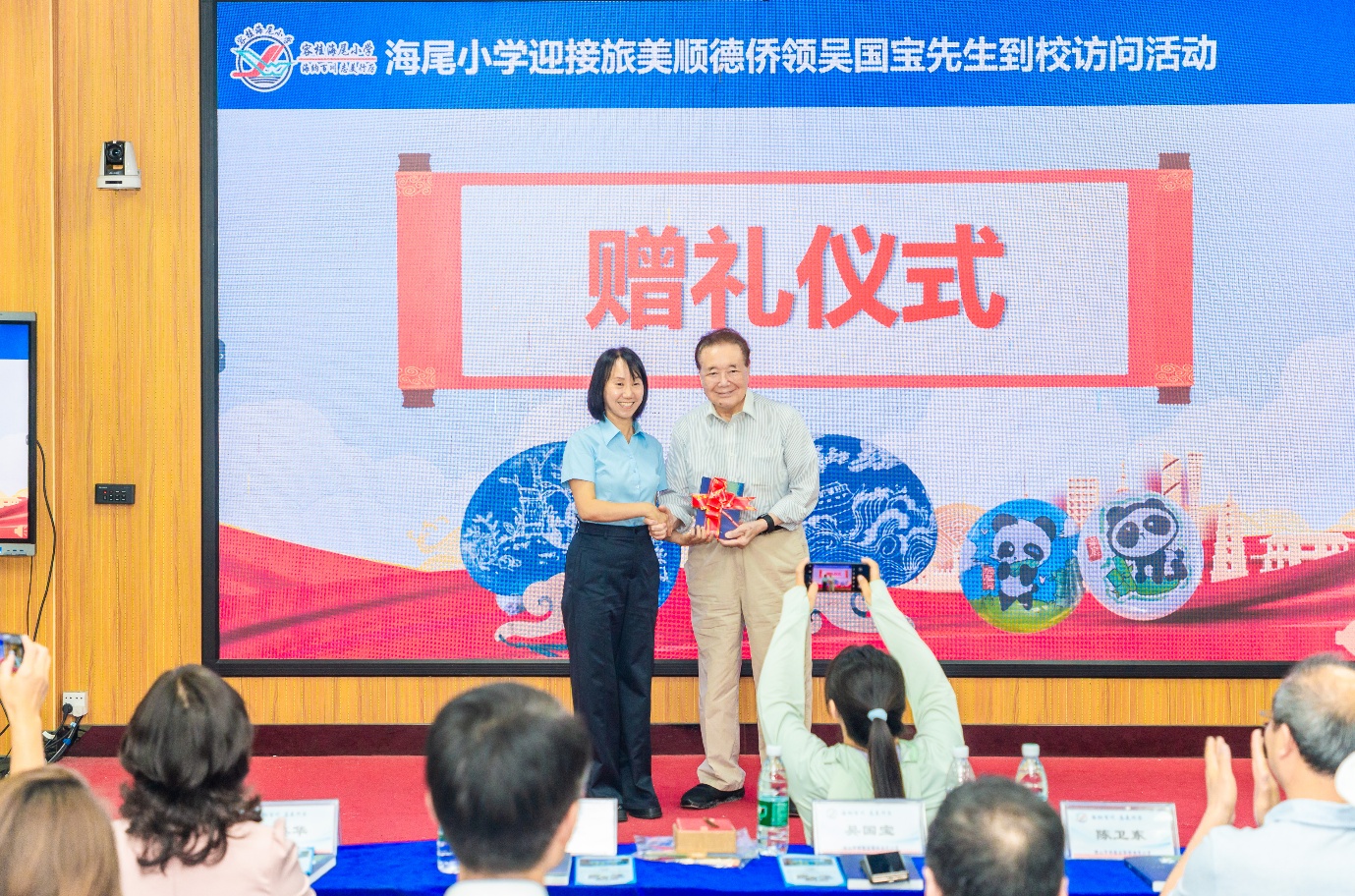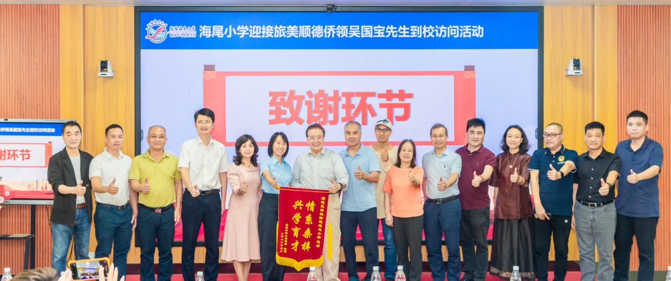 陈翠则将她创作的长篇小说《出海》赠予吴国宝,该书讲述了顺德企业全球布局、攻坚克难、成功上市的奋斗历程,与华侨在海外拼搏奋进、反哺家乡的精神高度契合。作为回赠,吴国宝特意带来一面绣有“兴学育才,情系桑梓”八个大字的锦旗,赠予海尾小学。陈翠接过锦旗,表示将把其悬挂在校史室,以此激励一代代海尾学子奋勇前行、不负韶华。