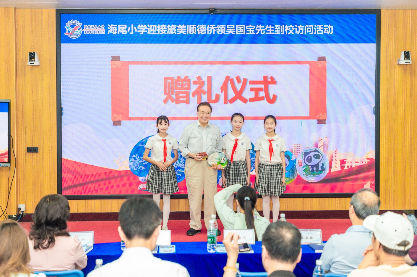 活动重头戏——“桑梓情深”爱国主义主题活动在学校电教室举行。海尾小学校长陈翠以“归去来兮”开篇致辞,热烈欢迎吴国宝荣归故里,详细介绍了学校“海纳百川 志美行厉”的办学理念、“爱音乐、爱打球、爱烹饪、爱读书”的“四爱”潜能教育特色课程,以及学校作为红色教育基地的百年历史底蕴。陈翠特别致谢吴国宝长期以来对家乡教育事业的倾力支持,并组织全体嘉宾共同观看了记录吴国宝十多年来深耕顺德教育、助力学子成长的纪录片。