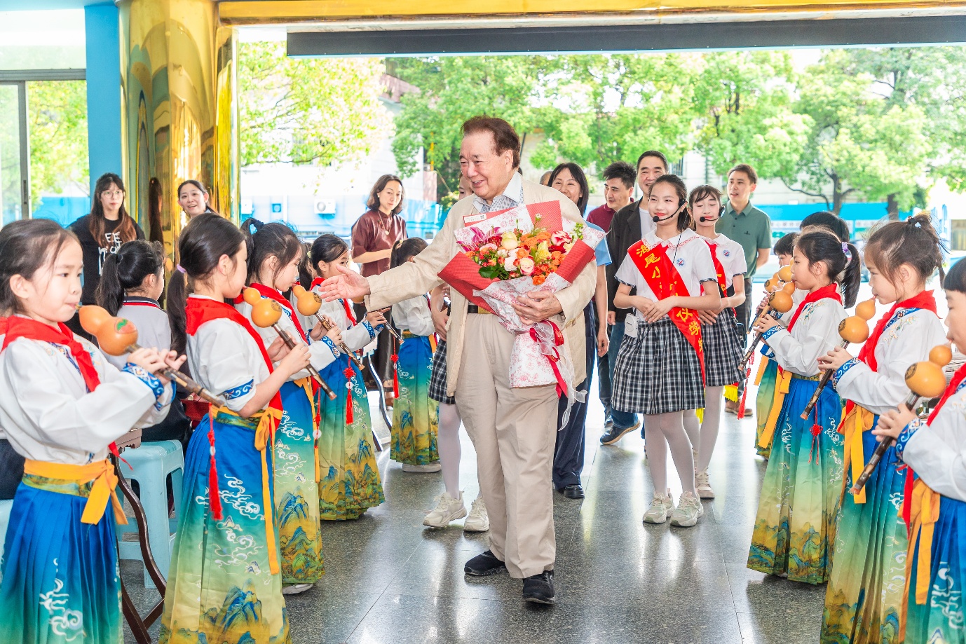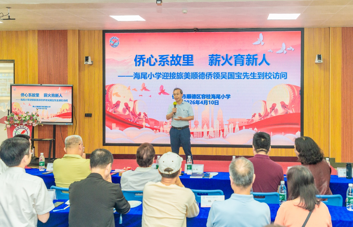 4月10日下午,顺德区容桂海尾小学校园内春意盎然、乐韵飞扬,以“侨心系故里 薪火育新人”为主题的旅美侨领吴国宝访校活动温情举行。88岁高龄的吴国宝与相关领导、侨界代表及教育界同仁一同走进家乡校园,与海尾小学全体师生共同参与这场兼具爱国主义情怀与桑梓深情的主题活动,用一生坚守诠释侨心向学、爱国爱乡的赤诚初心,为顺德青少年学子送上成长指引与殷切期许。