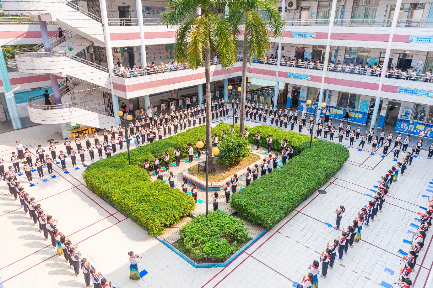 “雅韵”音乐大课间环节,成为此次访校活动的一大亮点。作为海尾小学每日风雨无阻开展的特色活动,全校学生现场展示了常态化、全员化的音乐素养。按照学校“让每个孩子都会一门乐器”的育人理念,一年级学生吹奏葫芦丝,二年级演奏哨笛,三、四年级研习排箫,五、六年级弹奏古筝,孩子们齐奏《龙的传人》,激昂旋律响彻校园、催人奋进。