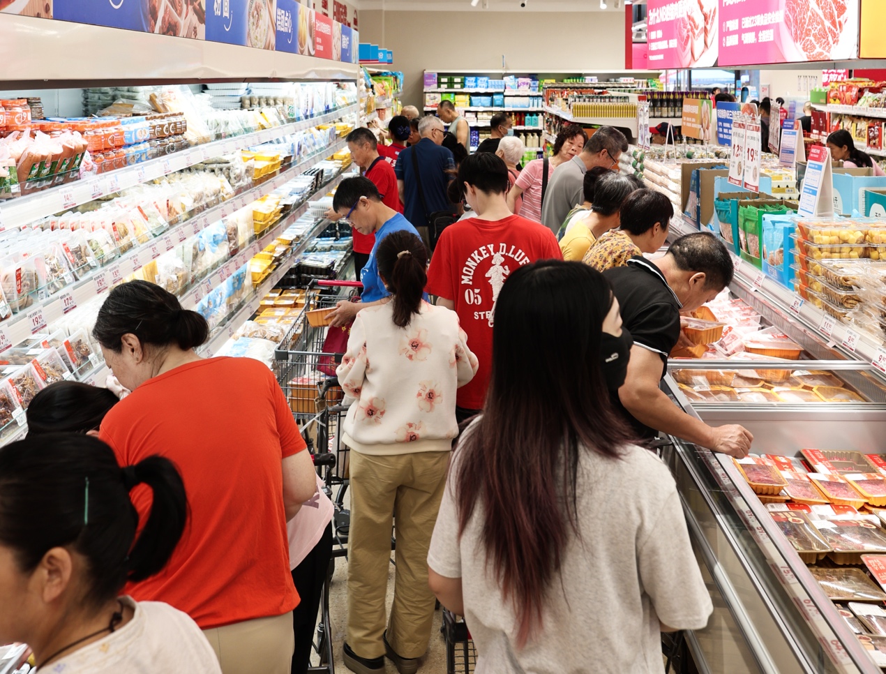 当天早上 8 点多,两家新店客流熙熙攘攘,开业不到两小时便启动限流,等候进店的市民在门口排起长队。9.9元30枚的鸡蛋、6.9元950ml的鲜奶、26.9元1.2公斤的猪小排、9.9元一条的鲈鱼……不少消费者购物车满载鸡蛋、蓝莓、猪小排、鲜奶等民生商品,直言“百蚊买两袋,好抵”,高性价比商品收获市民广泛认可。