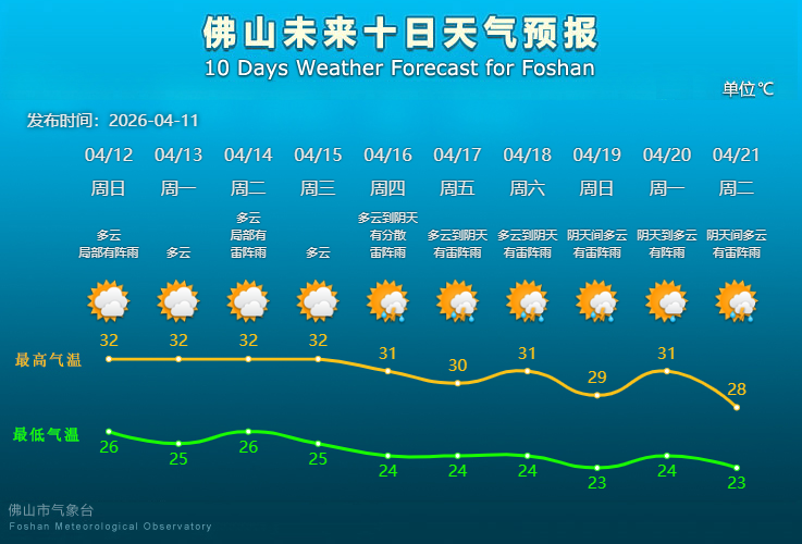 未来10天,佛山或持续闷热潮湿,雨水频频偷袭,市民外出最好随身携带雨具,注意防暑和防雨。其中,4月12日至15日受西南气流等影响,佛山云量较多,局部有阵雨,最高气温32℃;展望16日起雷阵雨每日打卡,最高气温略有波动,后期最高气温有望降至“2”字头。
