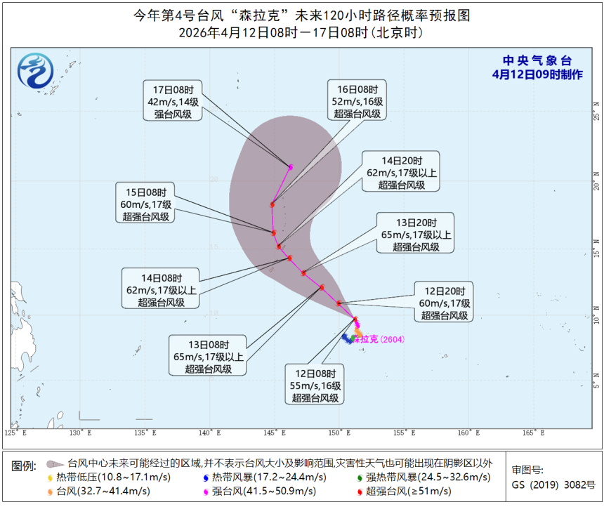 中央气象台4月12日预报,预计“森拉克”将以每小时15-20公里左右的速度向西北方向移动,强度继续加强,预计最强可达超强台风级(62-68米/秒,17级以上),逐渐靠近美国关岛附近洋面,14日夜间逐渐转向偏北方向移动。未来“森拉克”对我国近海无影响。