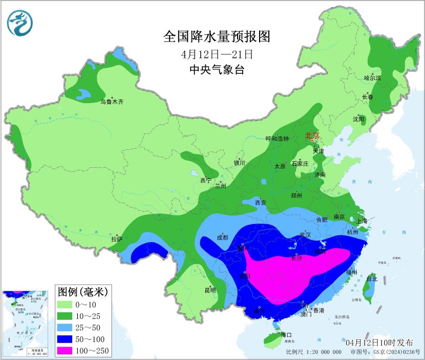 据中央气象台4月12日发布的中期天气预报,未来10天(4月12日至21日),江南、华南以及重庆、贵州等地多降雨过程,大致出现在12日至14日、15日至17日、18日至19日,上述大部地区雨日可达6~8天,部分地区伴有雷暴大风、冰雹、短时强降水等强对流天气。