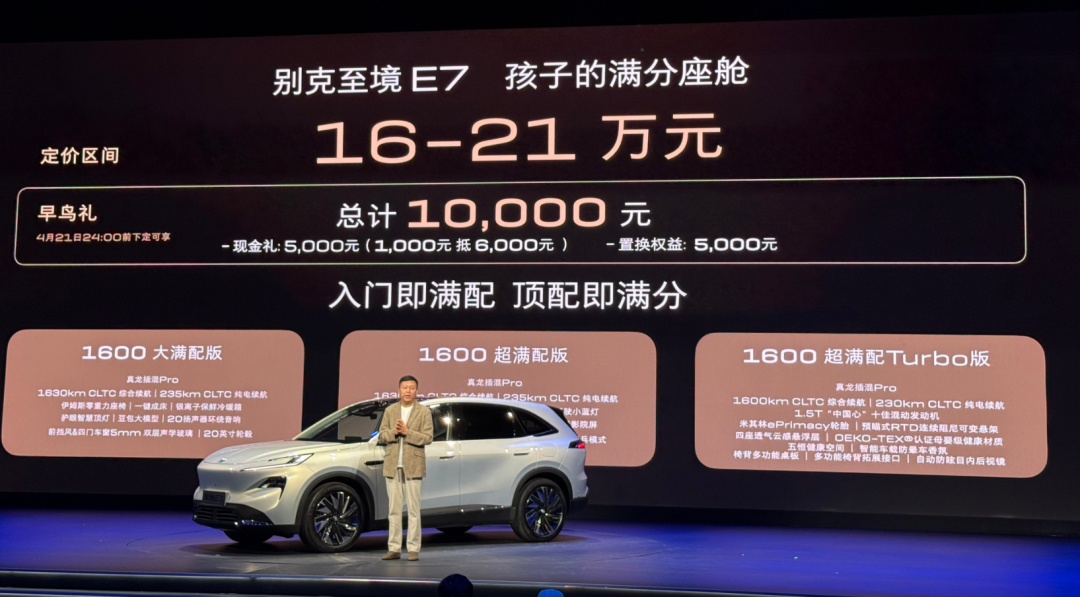 近日,上汽通用别克品牌旗下全新车型——至境E7正式开启预售。新车共推出3款车型,定价区间为16-21万元。新车是继至境L7以及至境世家两款车型之后,至境品牌旗下的第三款量产车型,定位大五座SUV,动力上提供1.5升插混和1.5T插混动力。按计划,新车将于4月22日上市。