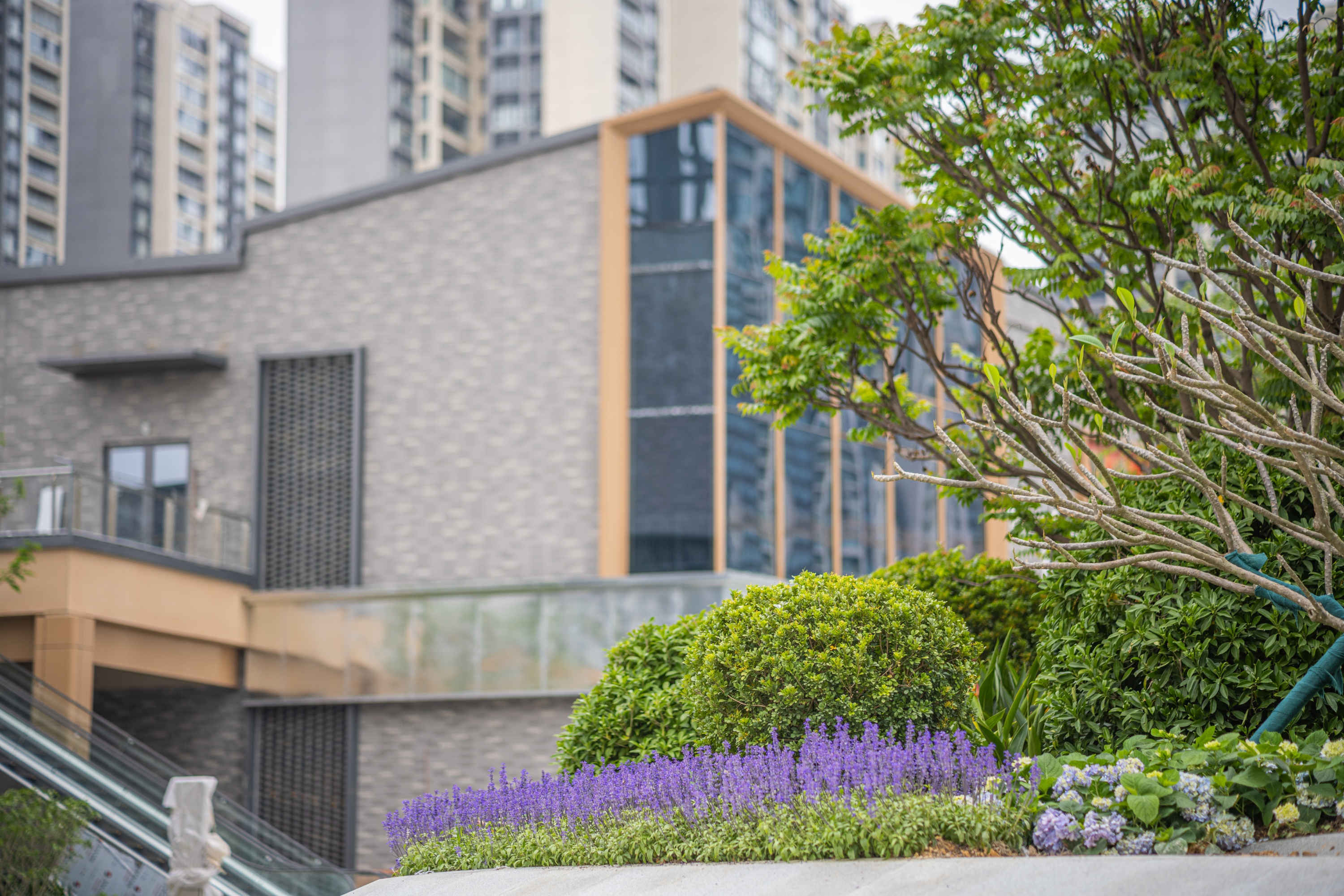 记者走进开放式街区,17栋独立商业建筑错落有致地分布在街区之中,采用低密度、街区式布局,整体建筑风格现代而富有质感。街区的景观绿化令人印象深刻——大型乔木已经落位,层次分明的花境沿步道铺展开来,绿植与建筑之间留出了充裕的步行与休憩空间。记者在现场看到,绿化工人仍在进行最后的苗木调整和地被补植,整个街区犹如一座城市中的“绿色客厅”。这正是项目园林设计“森林漫游”理念的具象呈现——通过大型乔木与层次花境营造自然野趣氛围,打造沉浸式消费环境。