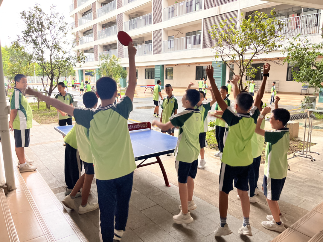 高明区第一中学实验学校学生在课间开心地打乒乓球。学校供图