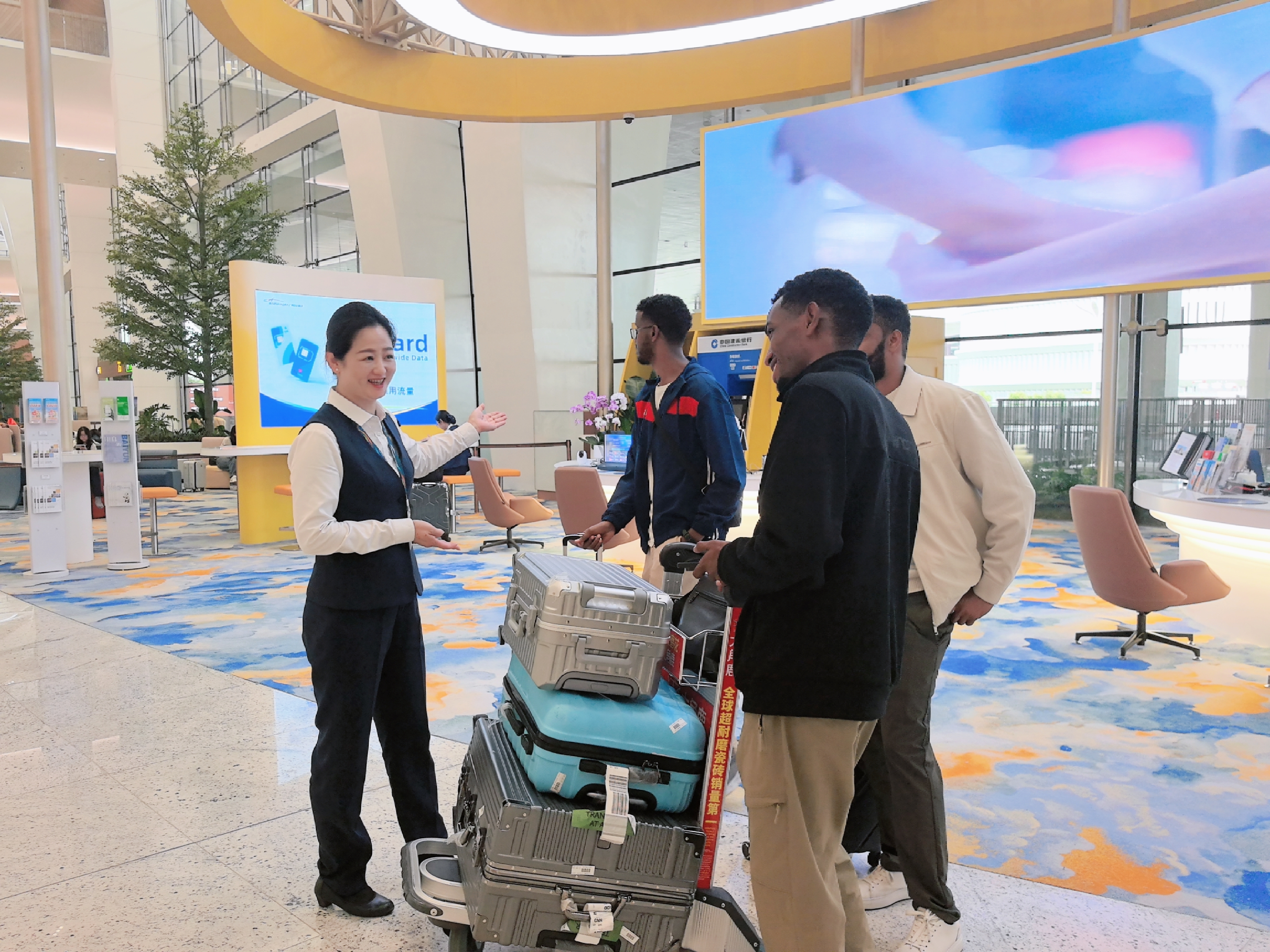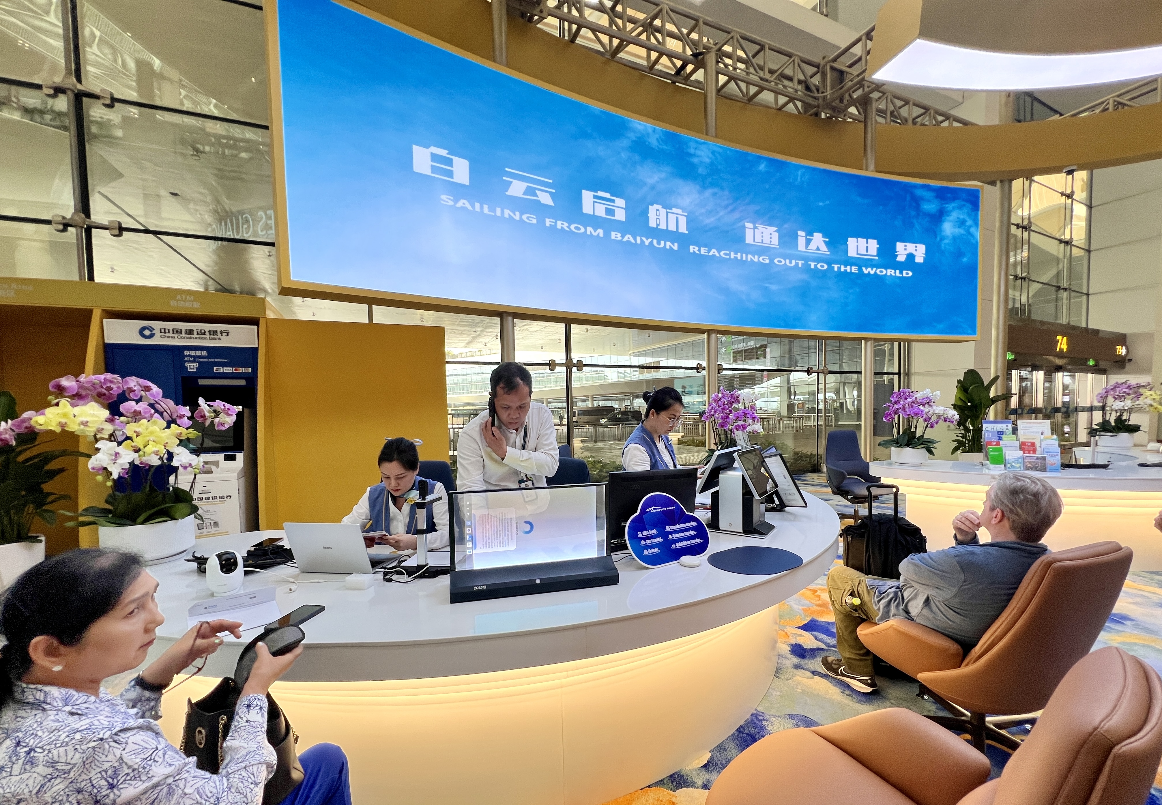 步入以“金穗黄”为主色调的T3服务中心,弧形接待柜台营造出专业而亲切的氛围。这里最大的亮点在于功能的高度集成,外籍旅客无需在机场内多处奔走打听,一个柜台便能解决入境后的燃眉之急。柜台旁的支付专区配备支持外卡取现的ATM机,并有专人手把手指导绑定移动支付;通讯专区可现场快速开通本地手机号码或办理集通信与支付功能于一体的“粤云卡”;交通专区从地铁线路指引到差异化租车预订提供全品类方案。对于前来参加广交会的展商,会展专区还可根据需求定制参展行程,真正实现了“落地即办事,一柜解百忧”。