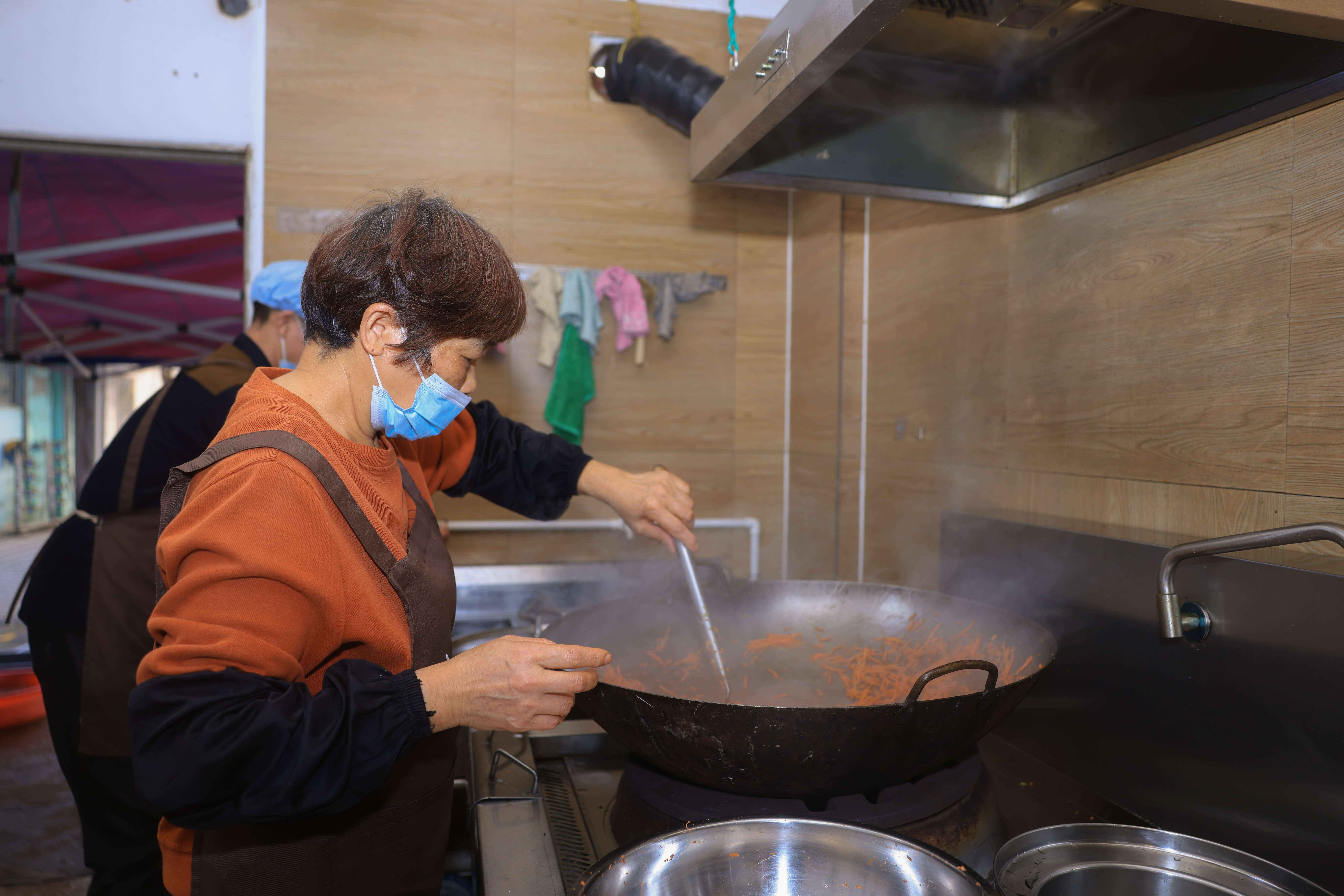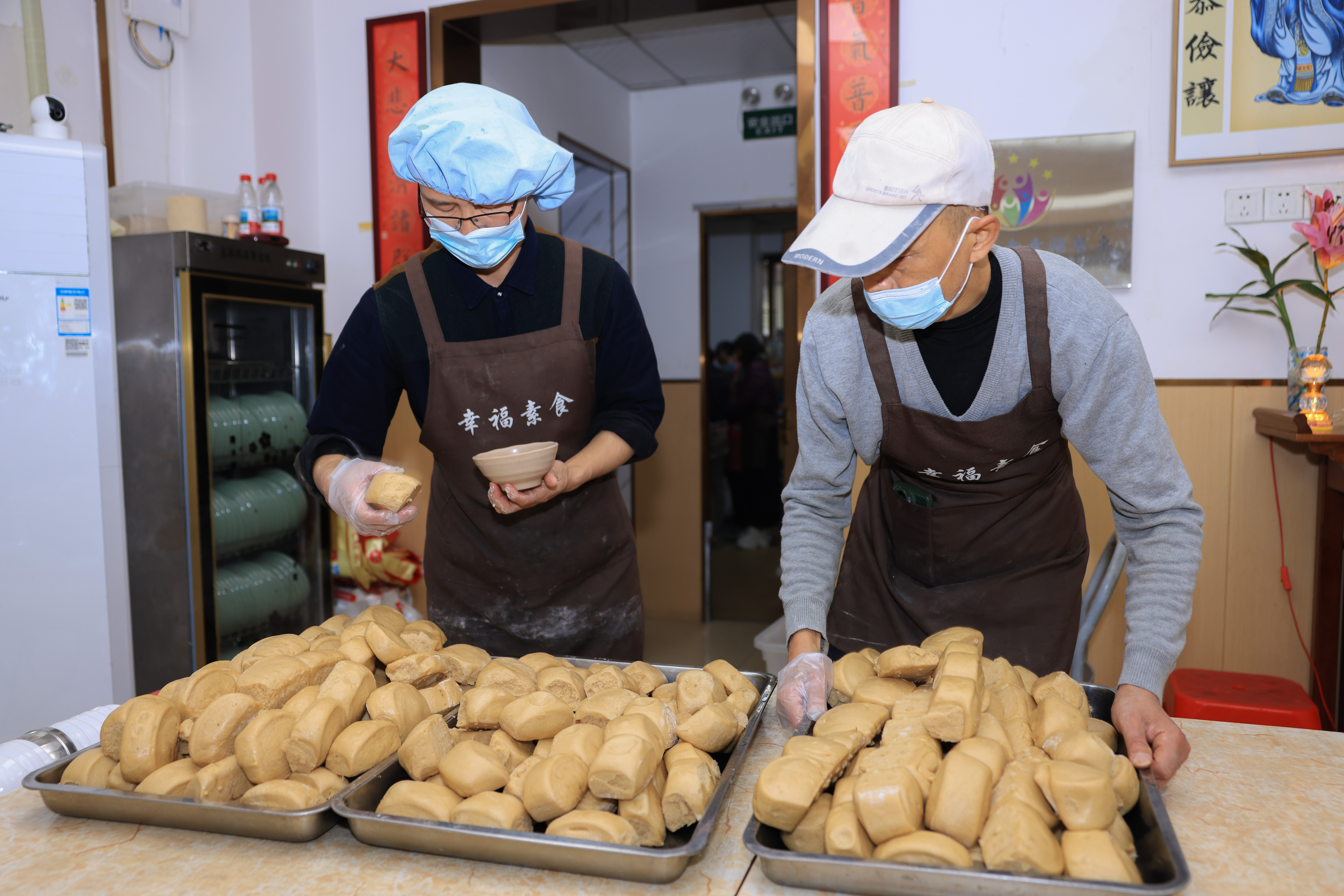 “今天做菜包、红糖馒头,再配一锅粥,都做得软乎些,老人吃得好消化。”黄小桥一边整理桌椅一边叮嘱,“多备点,至少150份。”