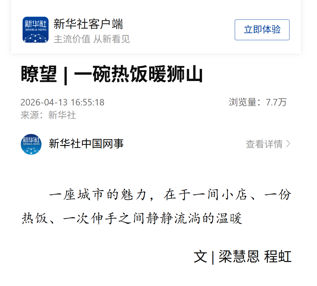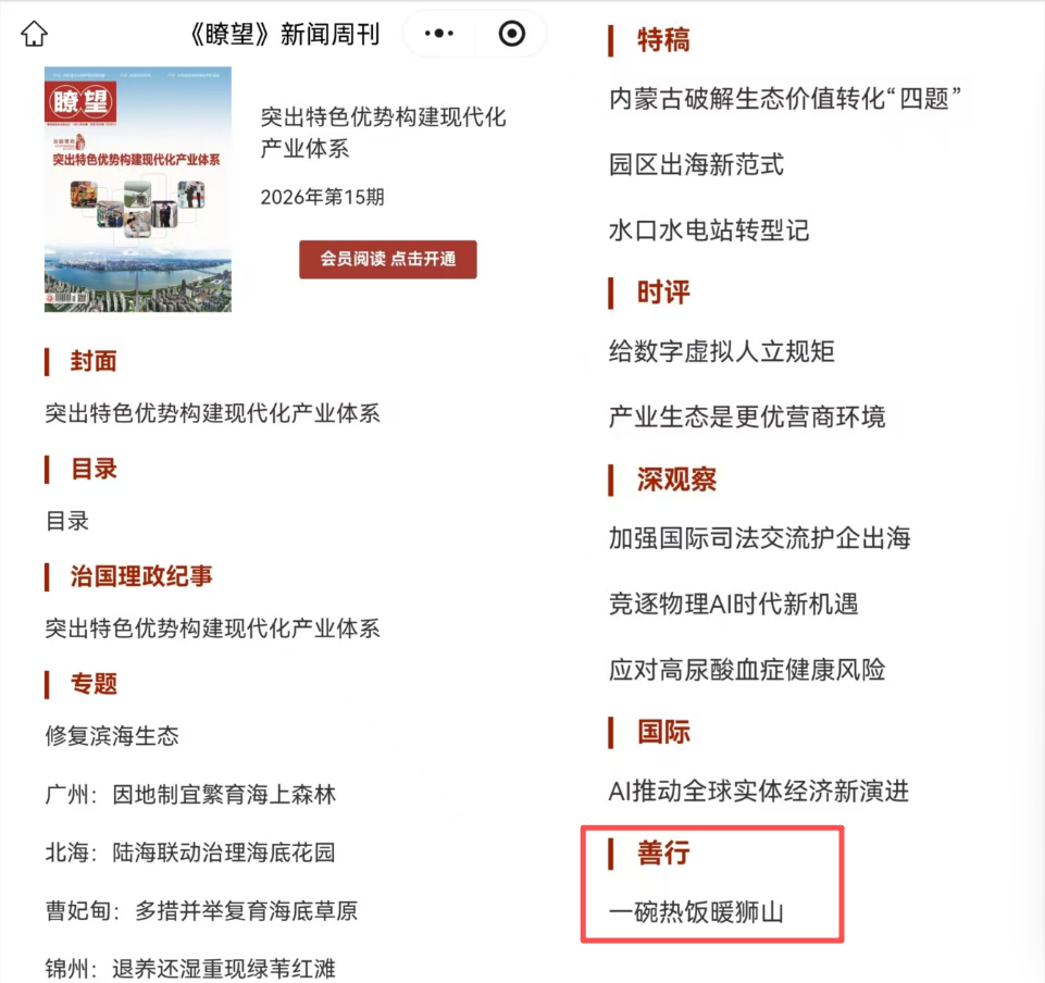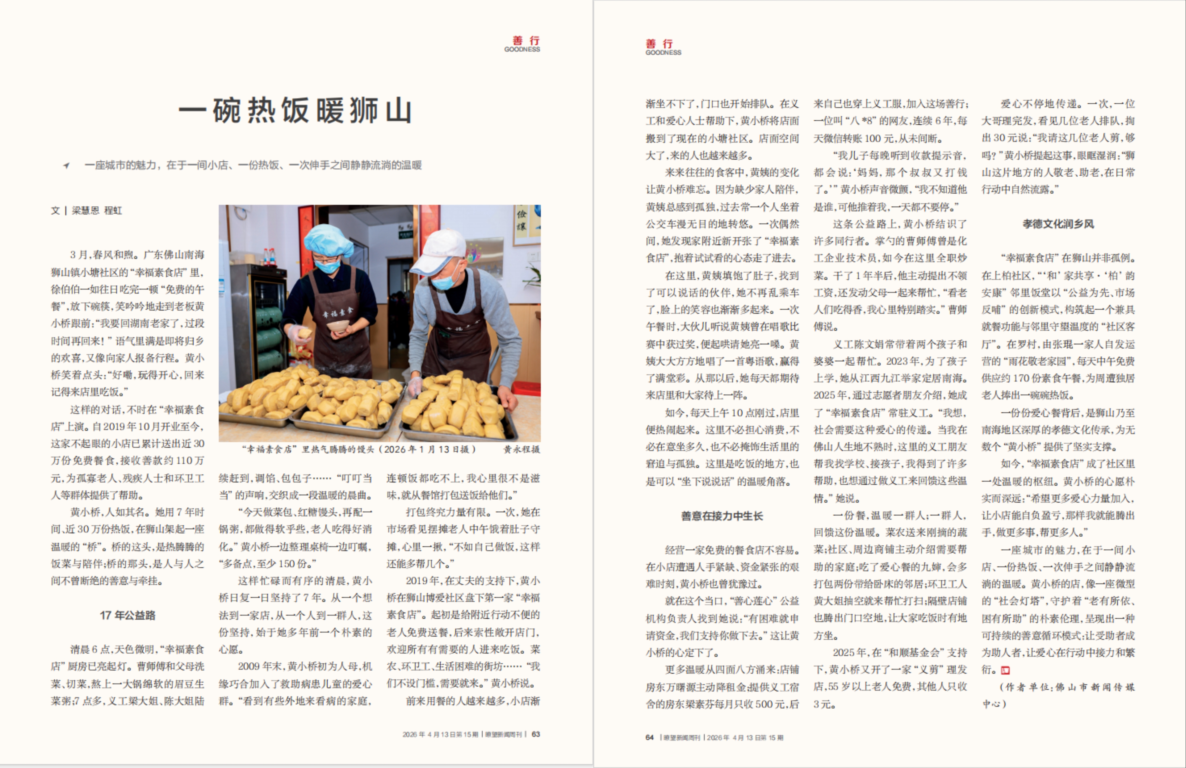 4月13日,由南海融媒报送的《一碗热饭暖狮山》登上最新一期新华社《瞭望》新闻周刊,以及新华社客户端,这则温暖的故事,让更多人看到了南海这座城市,一位普通店主与一群普通人共同书写的善行故事。