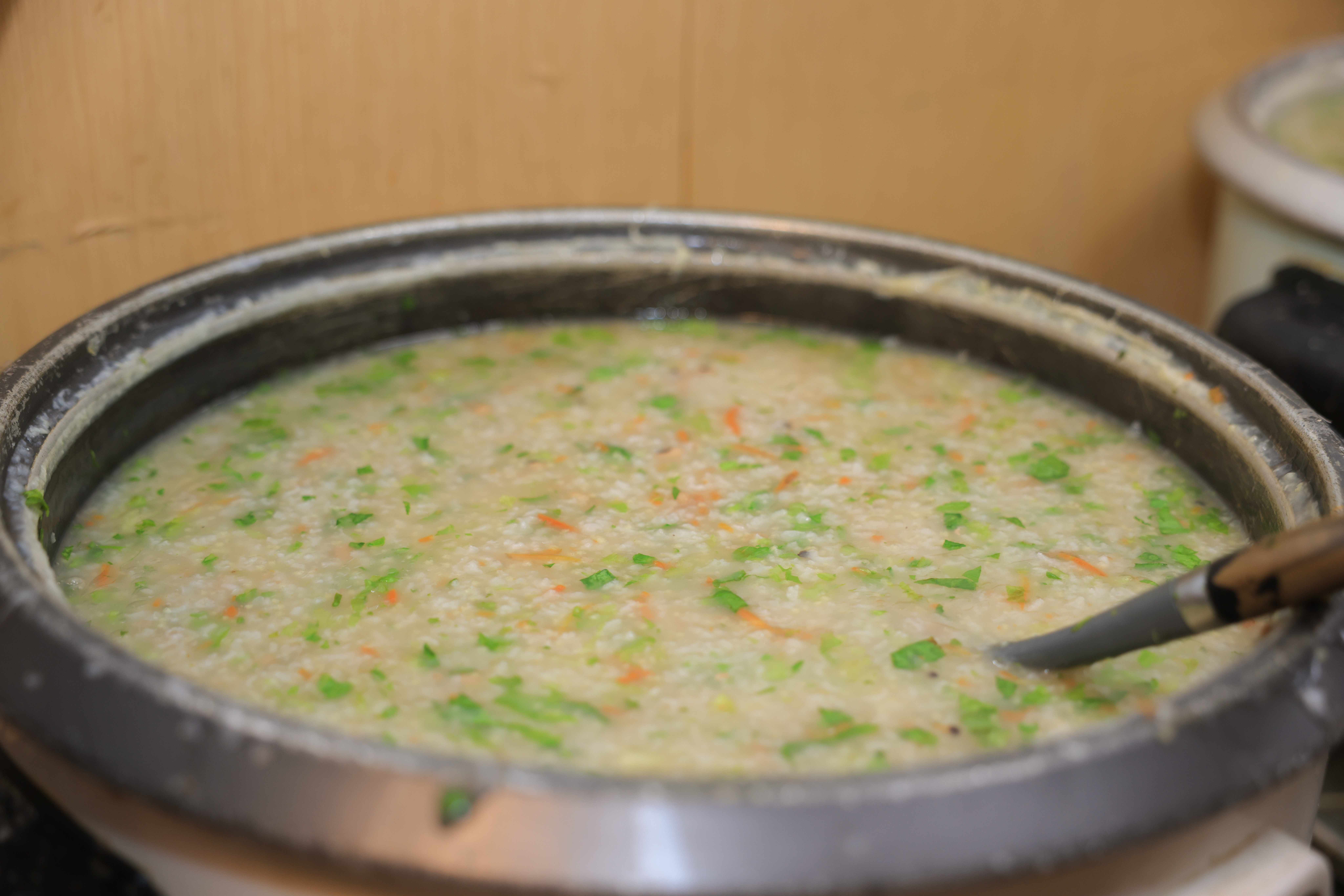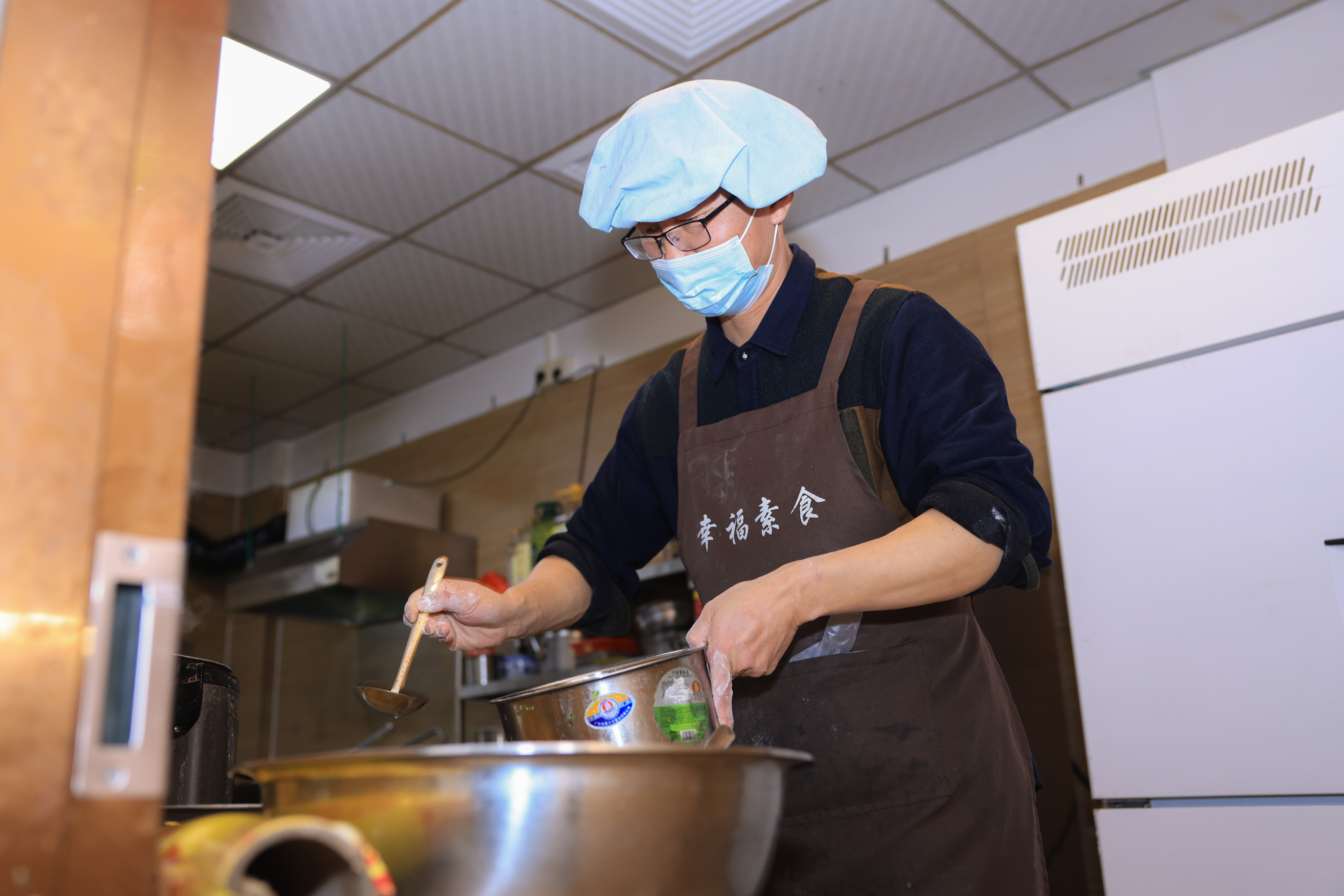 清晨6点,天色微明,“幸福素食店”厨房已亮起灯。曹师傅和父母洗菜、切菜,熬上一大锅绵软的眉豆生菜粥;7点多,义工梁大姐、陈大姐陆续赶到,调馅、包包子……“叮叮当当”的声响,交织成一段温暖的晨曲。