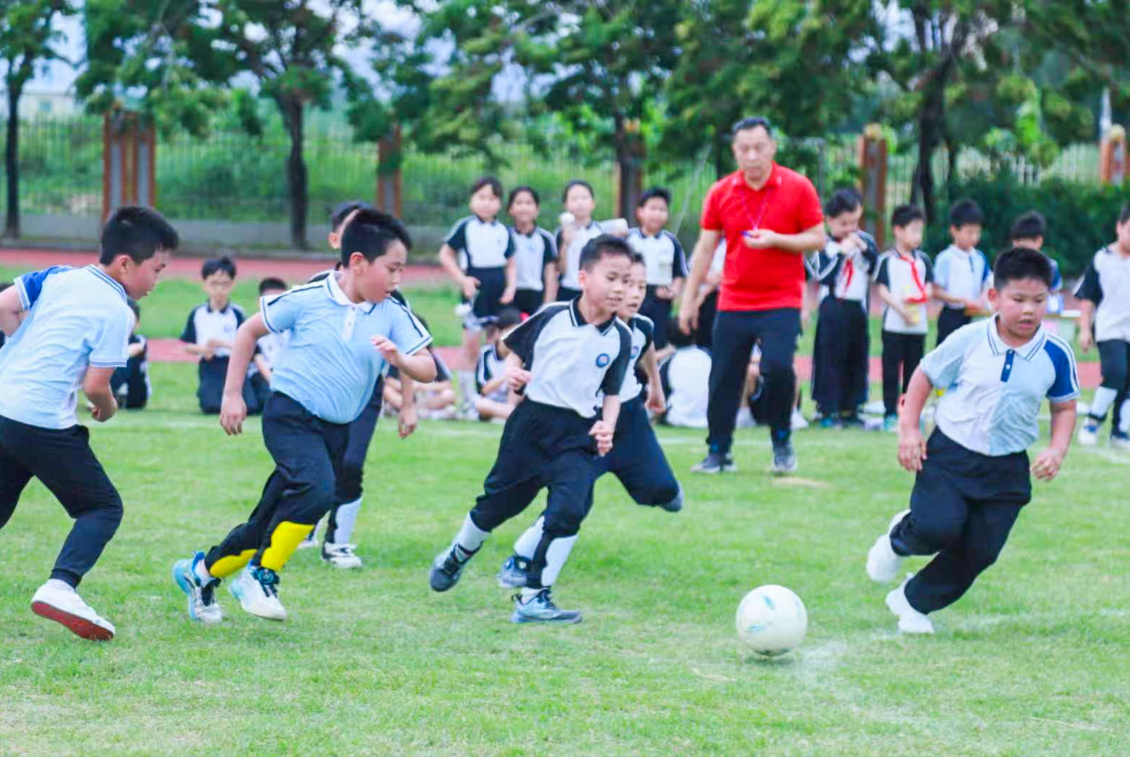 继顺德“德甲”足球赛事点燃全城足球热情后,校园足球活力也持续绽放。4月13日,乐从第二实验学校以“足”够快乐,“球”动童年为主题的班际足球赛同步拉开战幕,首轮登场的班级队伍悉数亮相,小球员们在绿茵场上展开激烈角逐。