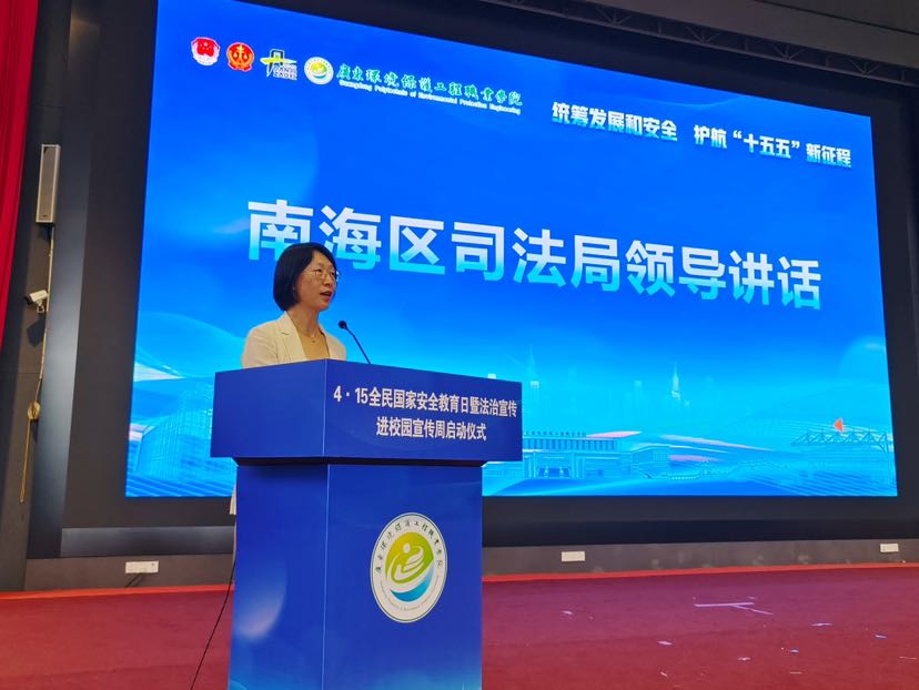 4 月 14 日,在第十一个全民国家安全教育日来临之际,南海区司法局联合区人民法院、区人民检察院、丹灶镇人民政府,走进广东环境保护工程职业学院,开展 “统筹发展和安全 护航‘十五五’新征程”4・15 全民国家安全教育日暨法治宣传进校园活动。