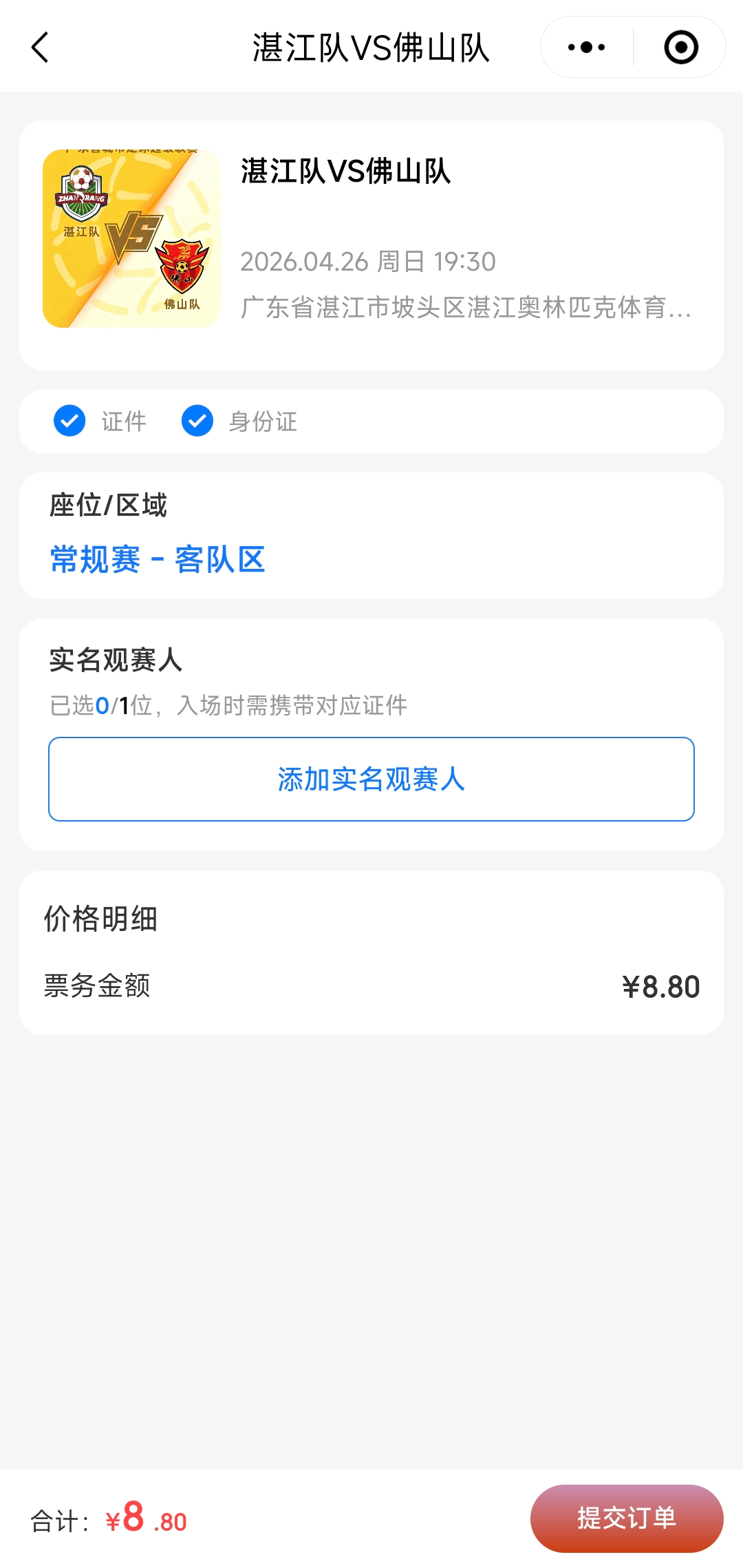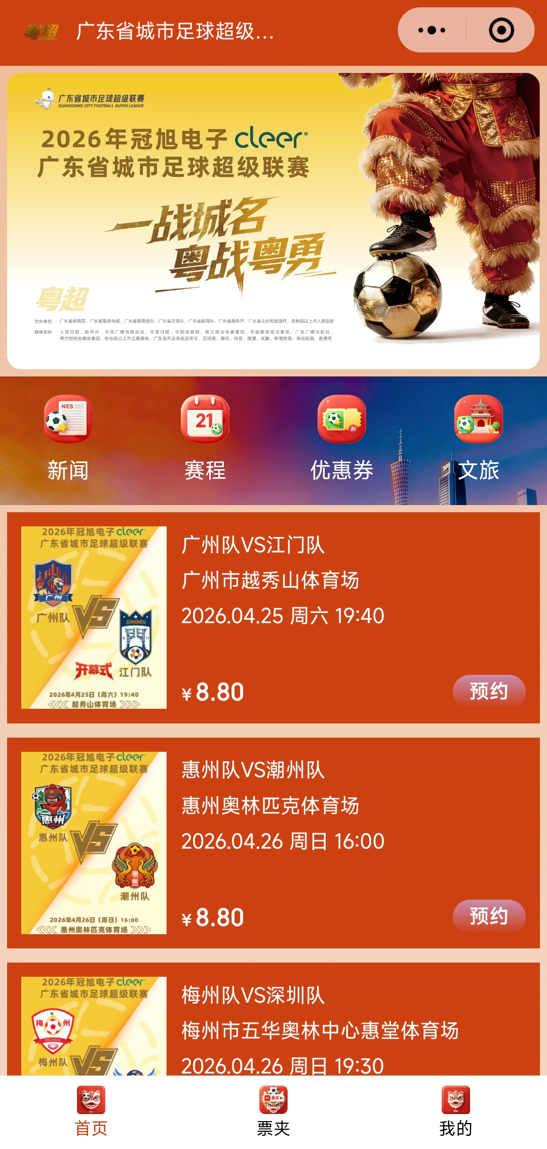 4月15日上午10时,2026年广东省城市足球超级联赛(以下简称“粤超”)首轮赛事购票预约正式开启,常规赛统一票价仅8.8元,惠民亲民。本届粤超将于4月25日在广州揭幕,佛山队首轮将客场出征,于4月26日19:30在湛江奥体中心体育场对阵湛江队,佛山球迷可通过官方渠道预约门票,为家乡球队呐喊助威。