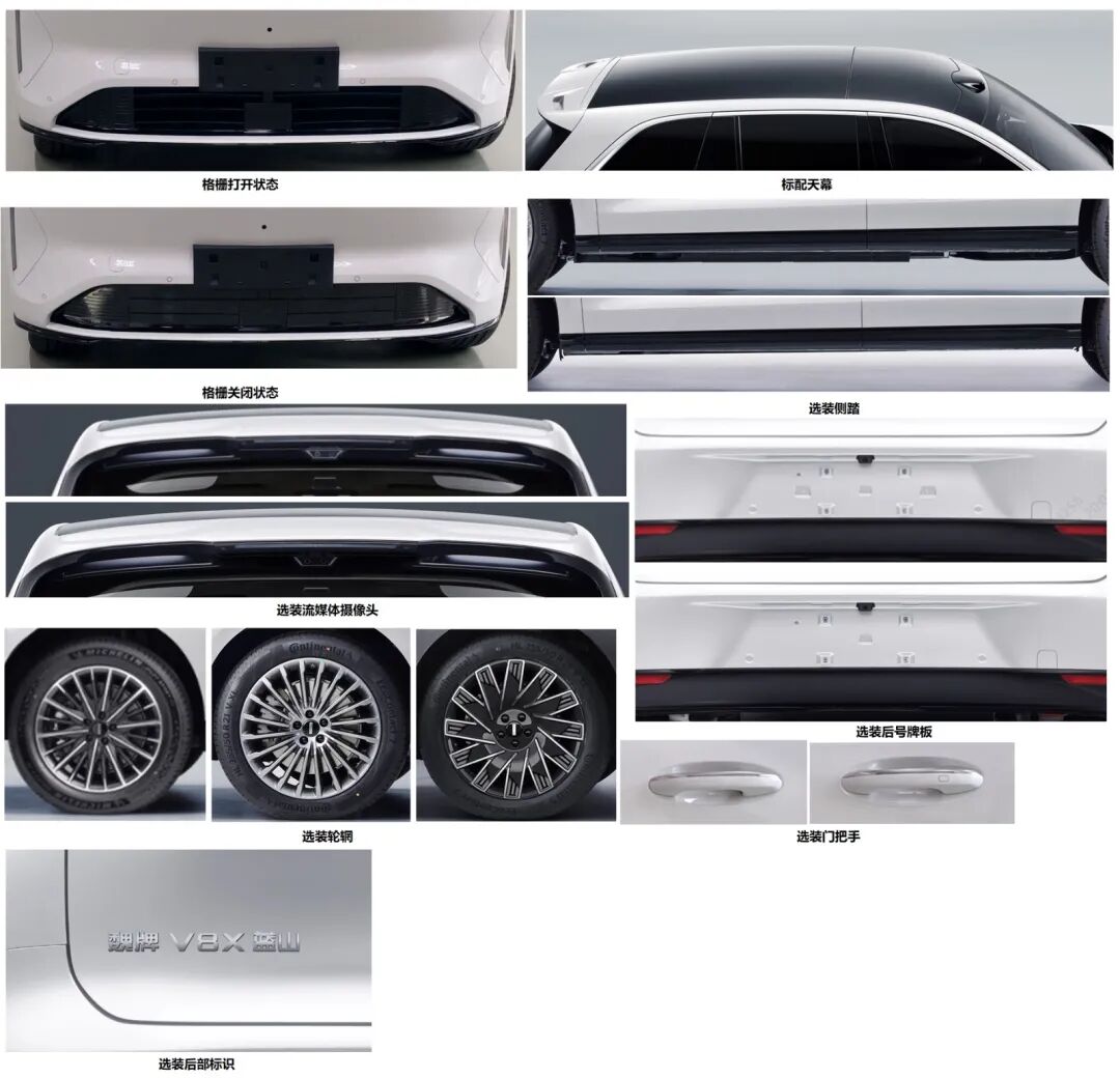 外观方面,新车延用魏牌最新家族化设计语言,整体与V9X高度相似,前脸采用大尺寸格栅搭配贯穿式LED灯带设计,灯组中央搭配可发光的悬浮立体车标设计,点亮后辨识度拉满,前包围配备贯穿式进气口与银色护板,整体看起来非常大气稳重。另外,新车车顶标配激光雷达,预计支持高阶辅助驾驶功能。车身侧面,新车线条流畅,采用贯穿式腰线搭配悬浮式车顶设计,营造出修长优雅的车身姿态以及运动属性。车尾部分,新车配备贯穿式尾灯设计,并运用银色护板进行修饰,尾部带有“V8X”字样标识,后包围搭配简约大气的设计,排气方面,新车采用隐藏式排气布局。