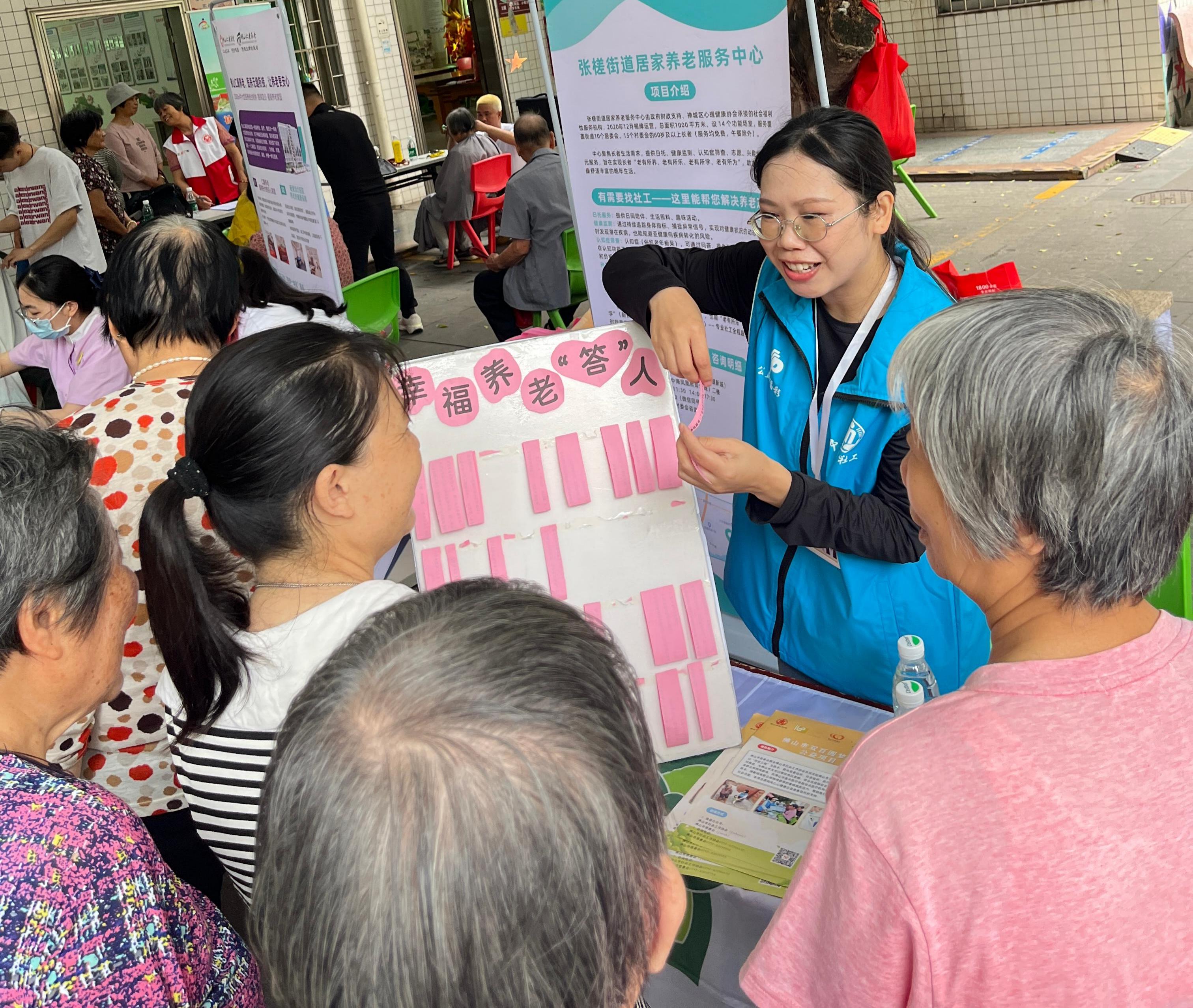 在政策宣传区,双百社工为长者们细致讲解了2026年度广东省中度失能老年人养老消费补贴、高龄津贴、免费体检、白内障手术补助、老年人优待证办理、退休养老资格认证、佛山市健康公益项目等多项核心政策的申请条件与流程。为了让政策入脑入心,活动特别设计了“幸福养老‘答’人”有奖问答互动游戏。长者们踊跃参与,在趣味十足的问答环节中积极抢答,既检验了学习成果,又在欢声笑语中显著提升了对惠老政策的知晓度与理解力。