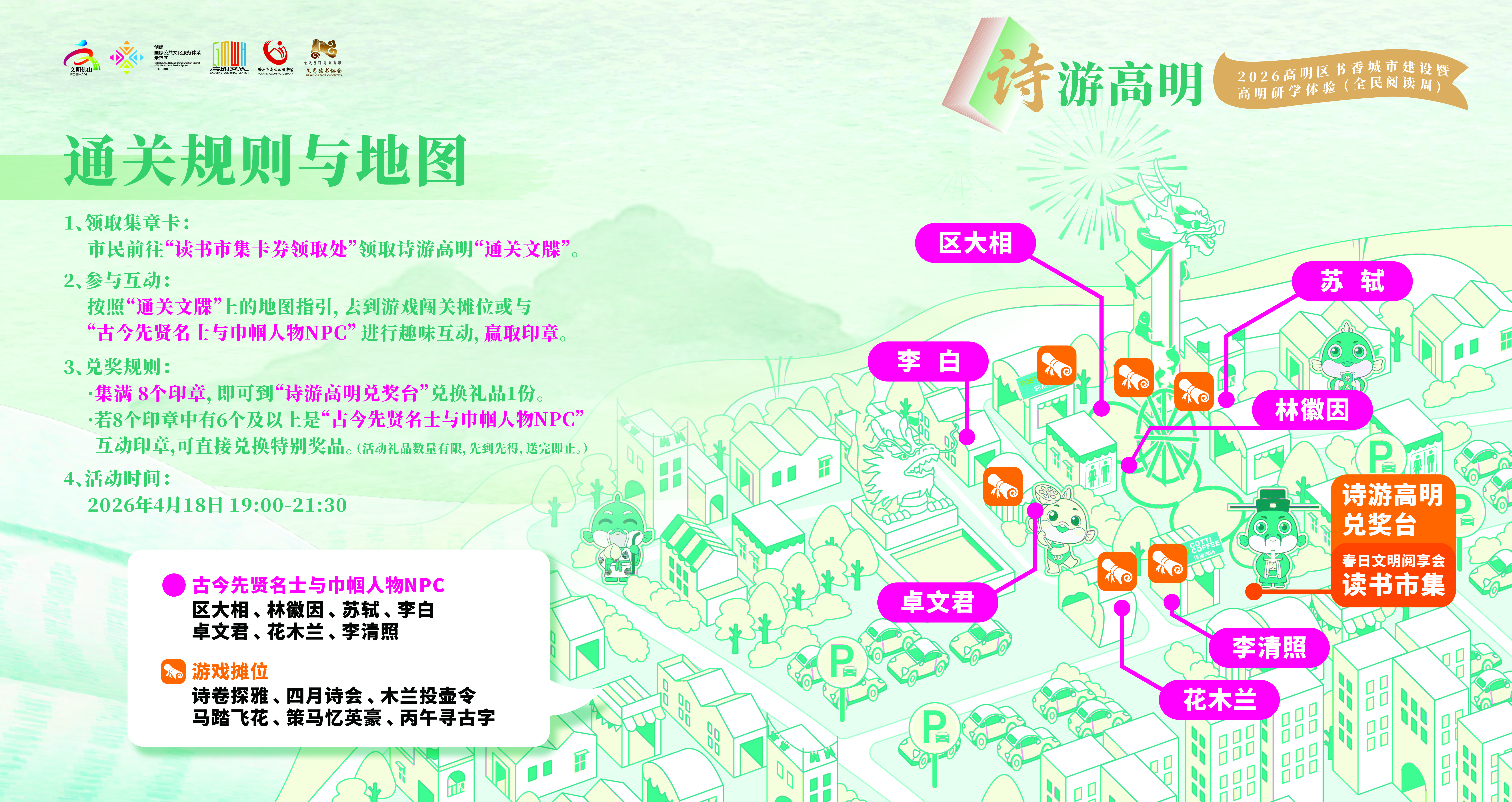 晚上19:00-21:30,苏村灯火通明,林徽因、李白、李清照、苏轼等先贤名士与巾帼人物NPC穿“阅”高明与你互动,舞台剧笑翻全场,还有“书香锦鲤”等你当——高明最潮的夜,就差你!