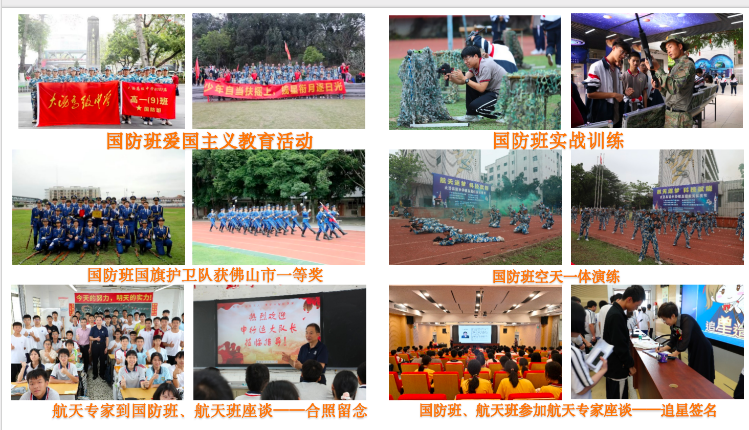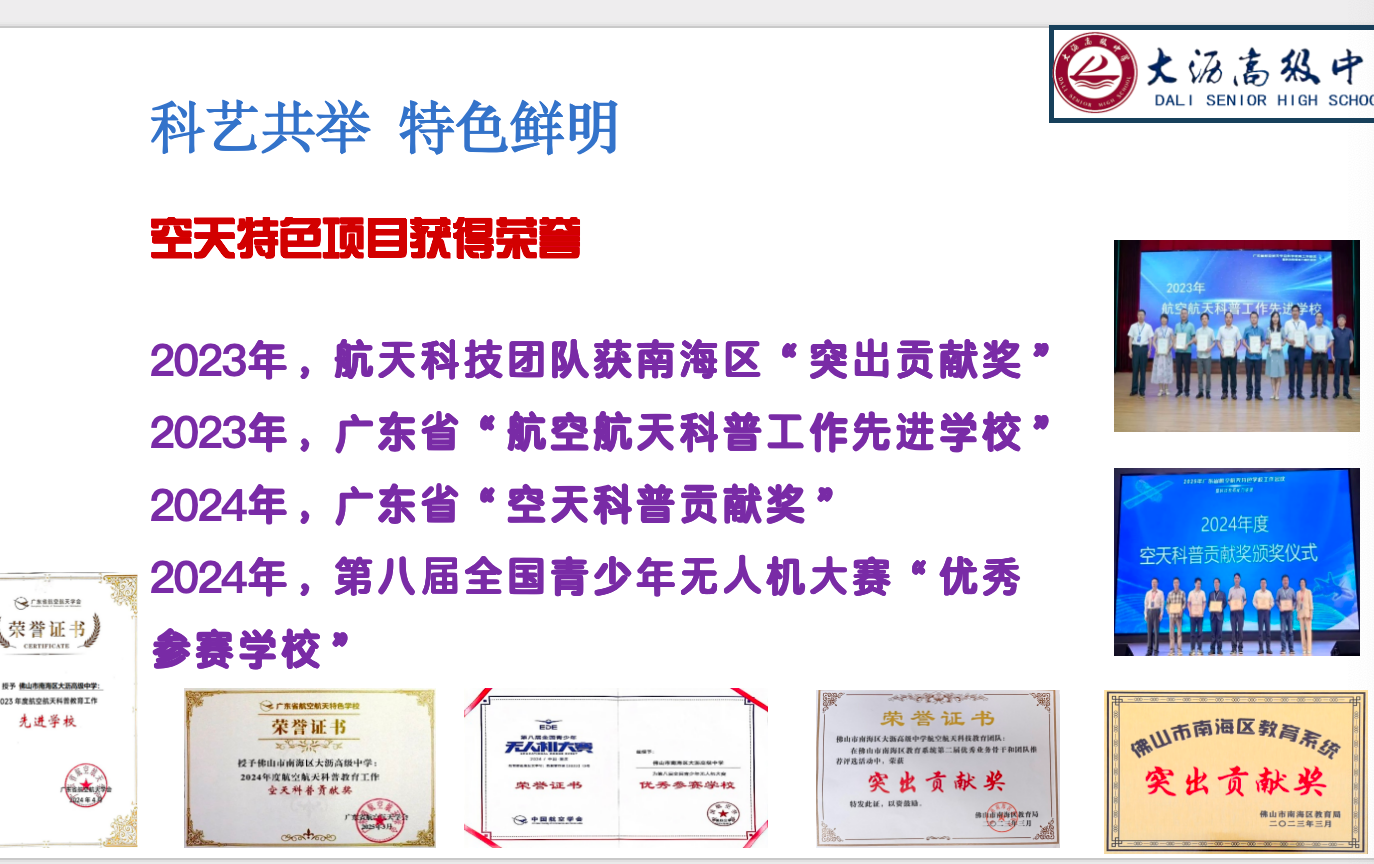 在教育教学方面,学校以国防与航天教育为核心特色,构建了多元化育人体系。2025年,学校获评 “广东省双拥模范单位”,是佛山唯一获此殊荣的学校;斩获广东省航空航天科普教育 “空天科普贡献奖”。另外,学校男篮斩获Jr.NBA 校园篮球联赛广东省冠军,在佛山市中学生篮球联赛实现七年六冠一亚;女足夺得南海区高中足球联赛冠军;学生李晓桐成为全国首位登上NBA季前赛的高中生。