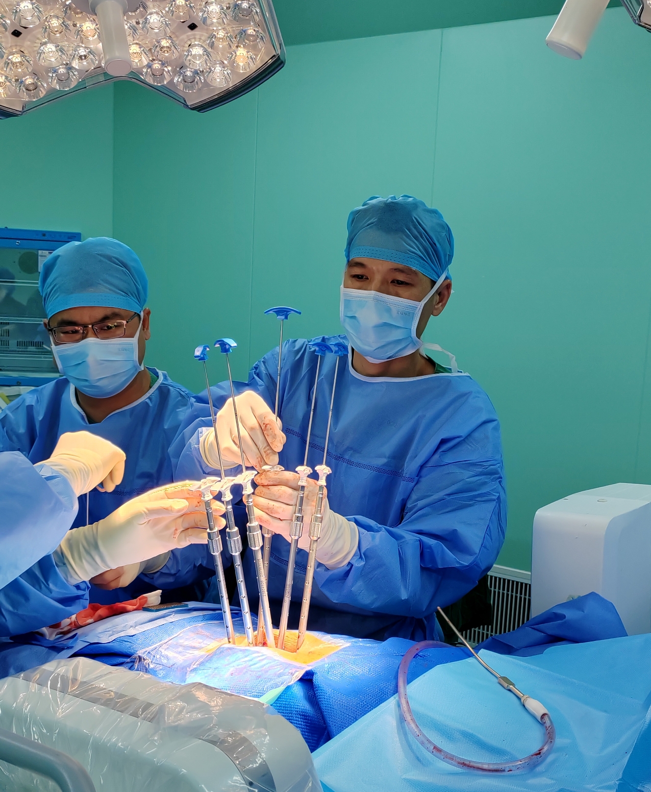 无影灯下,刘奋带领团队实施胸8爆裂性骨折后路切开复位内固定术。正中切口、精细分离肌肉软组织、暴露小关节、植入螺钉、通过连接棒撑开复位伤椎、清除椎管内碎骨及部分后侧骨质……