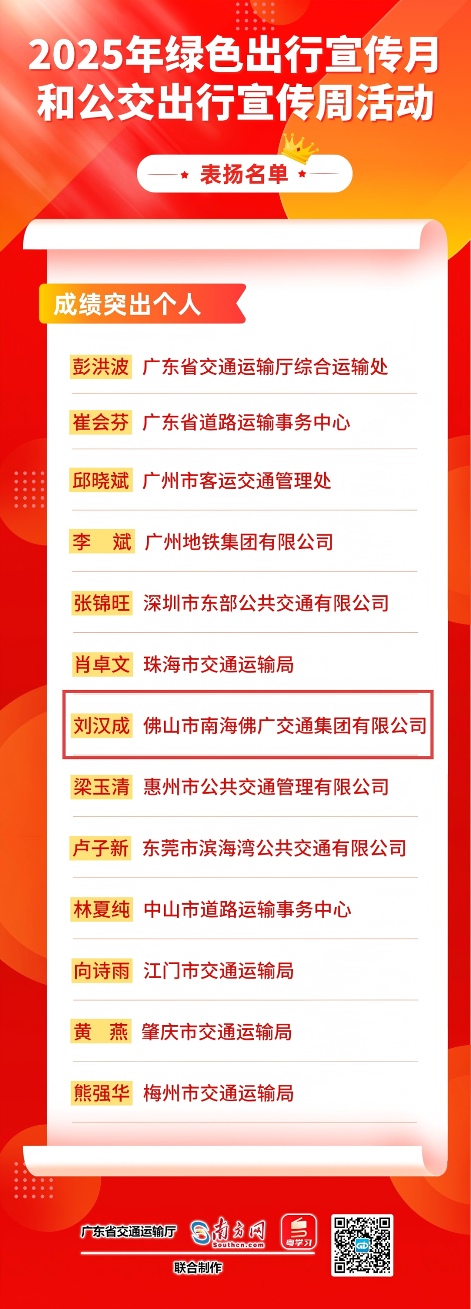 近日,交通运输部、公安部、国家机关事务管理局、中华全国总工会、共青团中央和中国残疾人联合会对在2025年绿色出行宣传月和公交出行宣传周活动中表现突出的集体和个人予以通报表扬。佛广集团公交车长刘汉成上榜“成绩突出个人”表扬名单。
