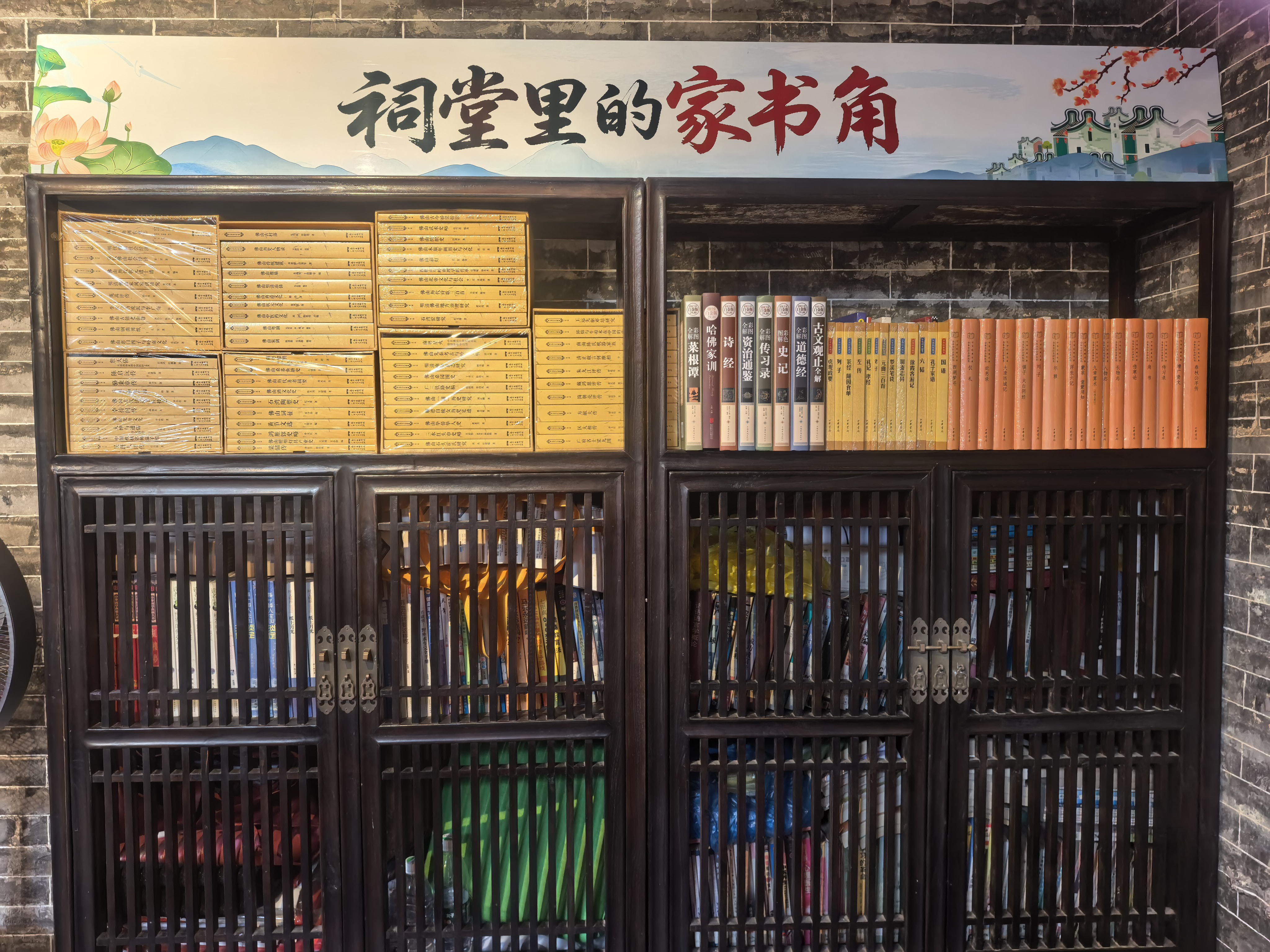 这是里水赤山村新落成的“祠堂里的家书角”,书架上,《曾国藩家书》《了凡四训》《增广贤文》等经典读物整齐排列,书籍由南海新华书店配送,赤山还向村民发起了“图书漂流”倡议,鼓励村民将家中富余的图书捐赠至家书角。各类图书与记录赤山700年变迁的村史档案相映成趣。这里不仅是村民休闲阅读的“文化客厅”,更成为了传播优良家风、涵养村风民风的新平台。