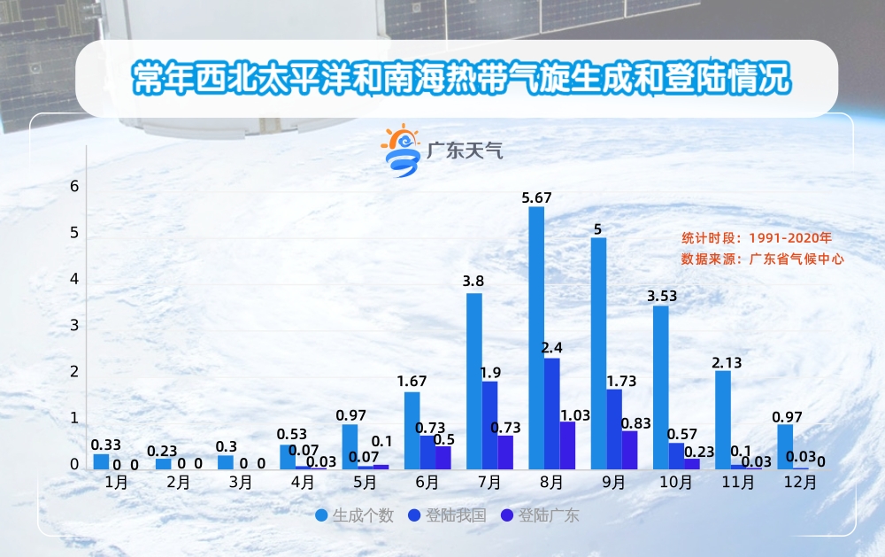 今年1月至4月,西北太平洋和南海海域始终保持每月都有1个台风生成的节奏,体现出生成个数显著偏多的特点。据广东省气候中心统计,1991年至2020年,西北太平洋和南海常年1月至4月的台风生成个数分别为0.33、0.23、0.3、0.53,总体约1.39个。