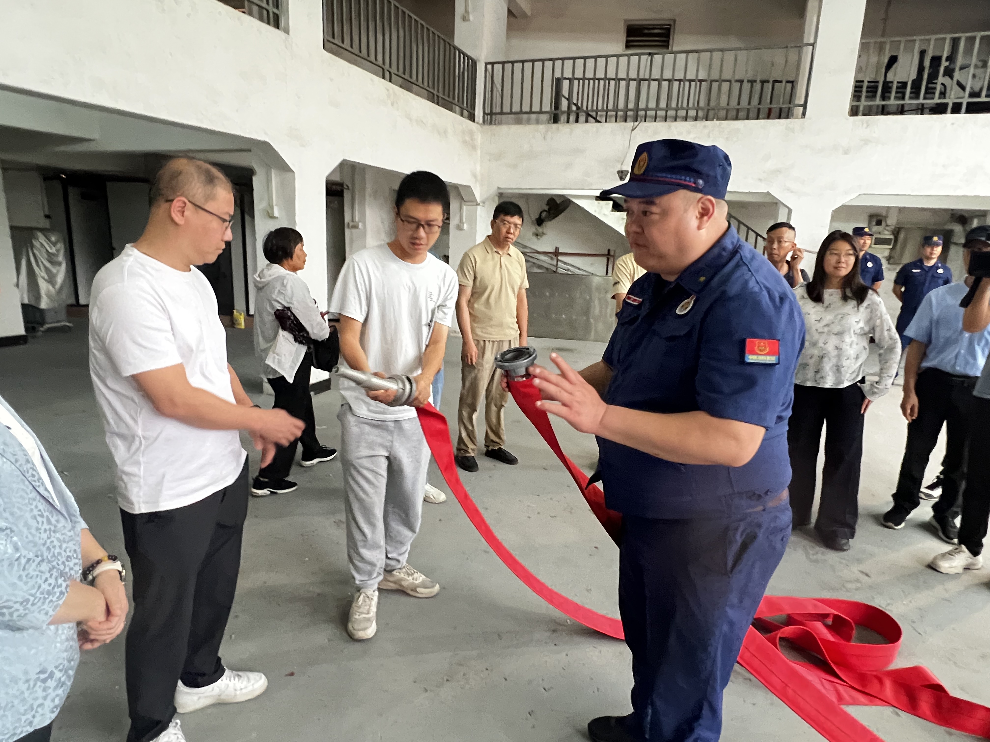 理论培训结束后,与会人员前往省级文物保护单位——平地黄氏大宗祠,开展实地教学。大沥镇应急管理办公室(消防救援)的技术指导员现场讲解了各类消防器材的使用方法,并组织灭火扑救演练。同时,针对古建筑的日常维护、巡查重点及注意事项进行了详细讲解和现场示范。