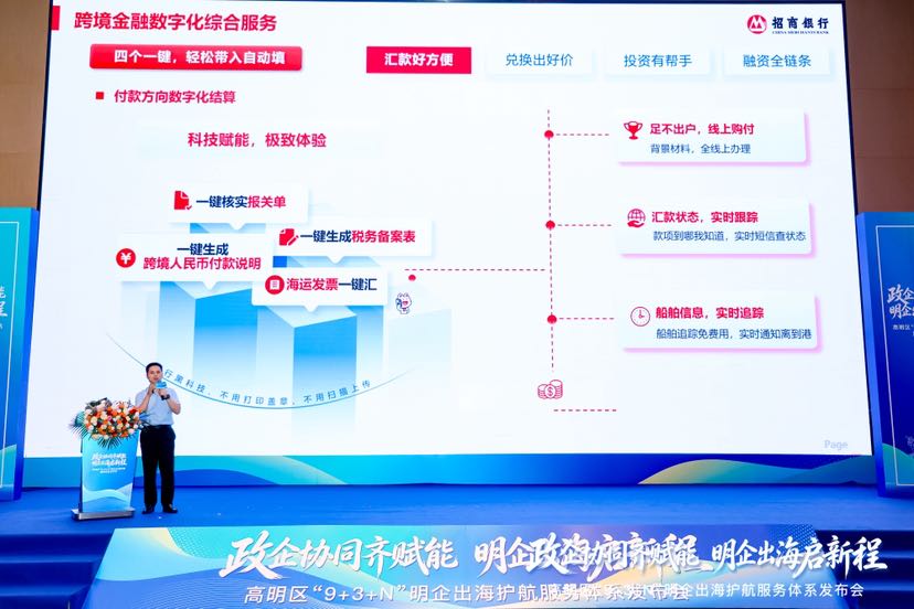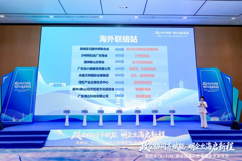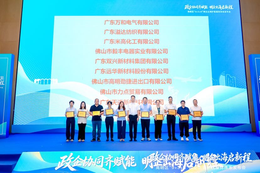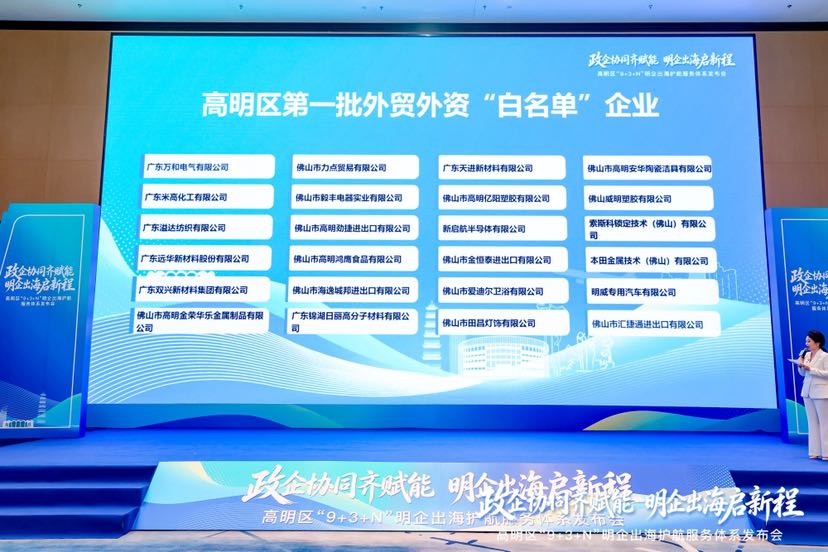4月17日下午,高明举行“9+3+N”明企出海护航服务体系发布会,主题为“政企协同齐赋能,明企出海启新程”。发布会旨在整合政企社多方资源,一站式破解企业在政策适配、金融支持、物流保障、风险防控等方面的痛点,推动外经贸高质量发展。