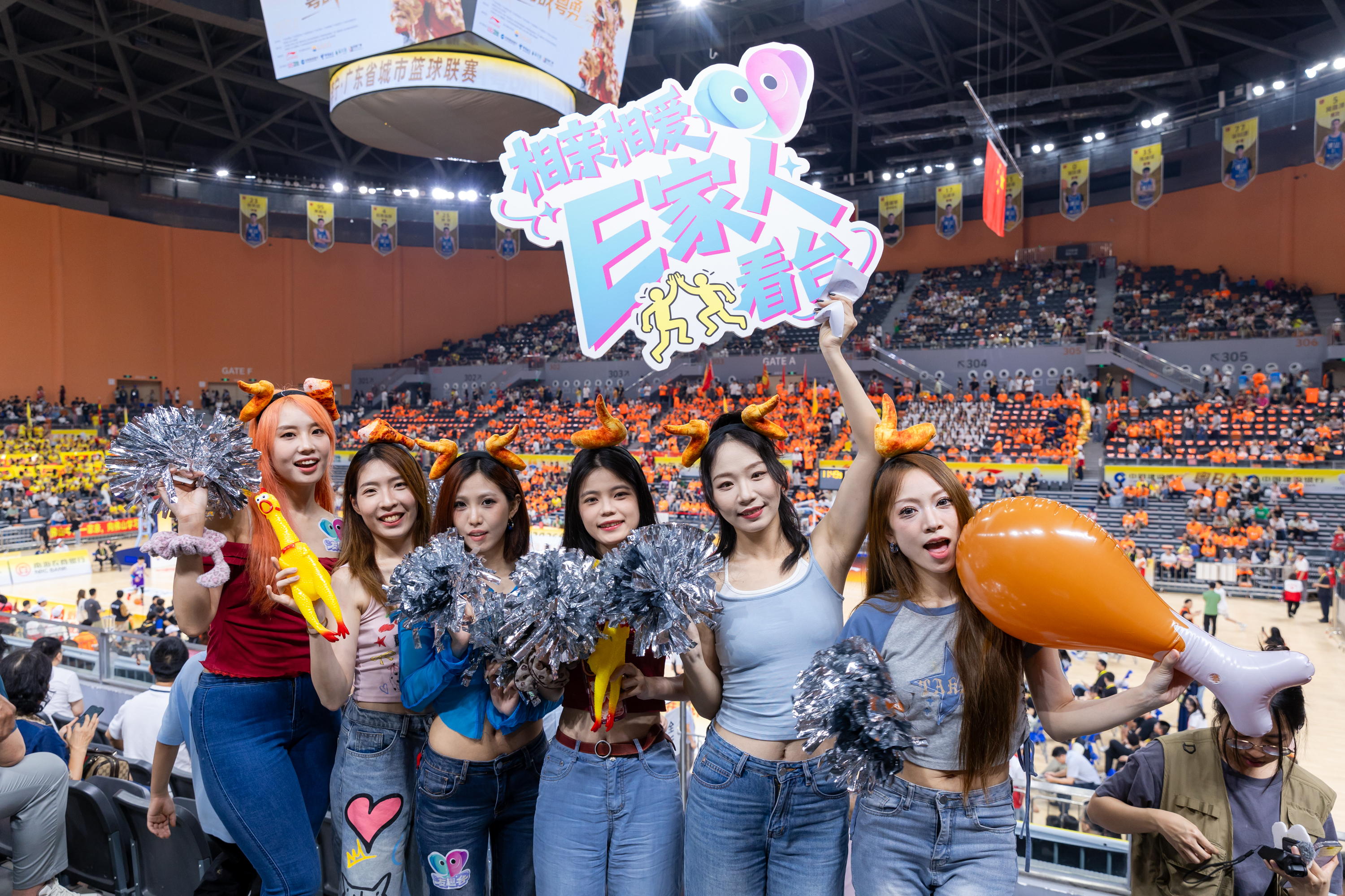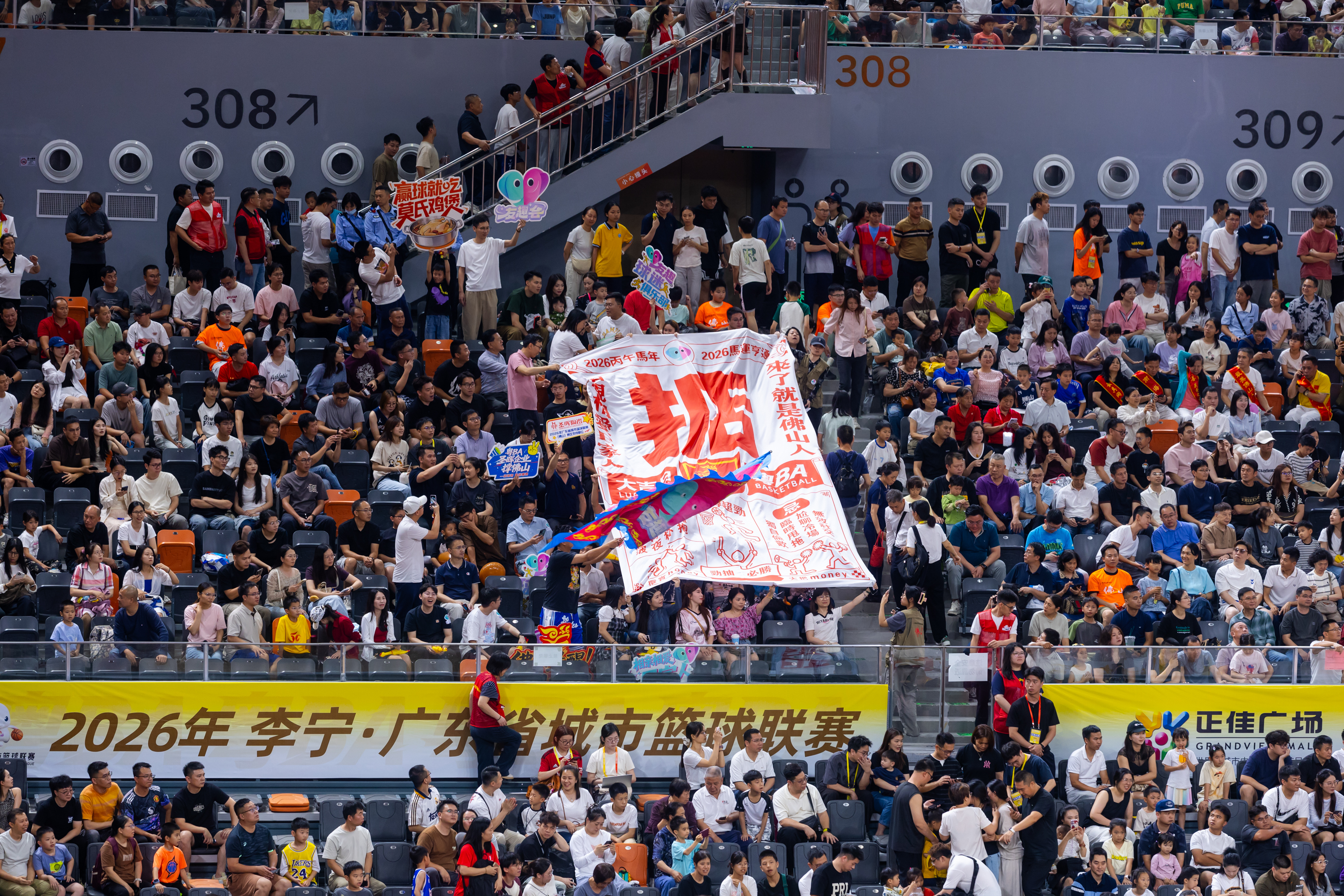 4月18日晚,粤BA佛山队在南海体育中心主场迎战中山队,过万名球迷齐聚一堂,热血呐喊响彻场馆。由佛山传媒文旅集团友趣球迷俱乐部打造的“相亲相爱E家人”看台方阵格外亮眼,一群热爱篮球的佛山青年和中山青年,以最燃姿态为家乡球队助威。