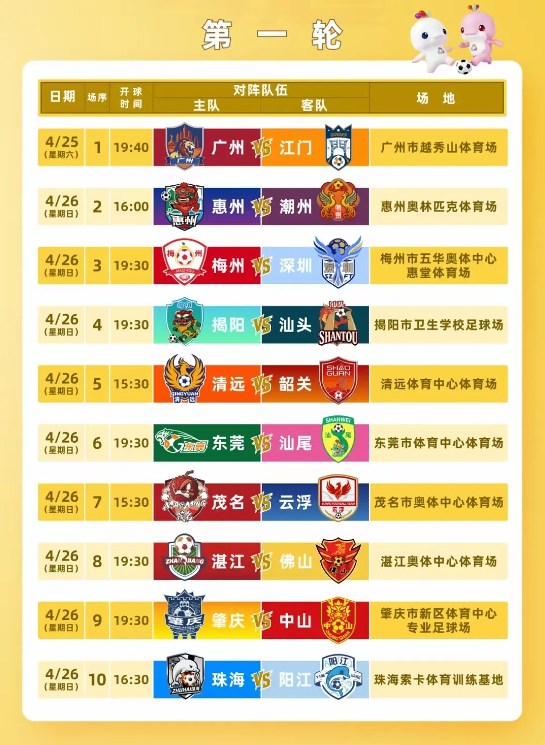 常规赛多在周末开赛,赛程横跨五一、端午、中秋等重要节假日,充分兼顾球迷观赛时间。佛山队全部主场赛事均设在三水云秀山体育场,这座因佛山“西甲”声名远扬的专业球场,将成为本土球迷为家乡球队呐喊助威的专属阵地。