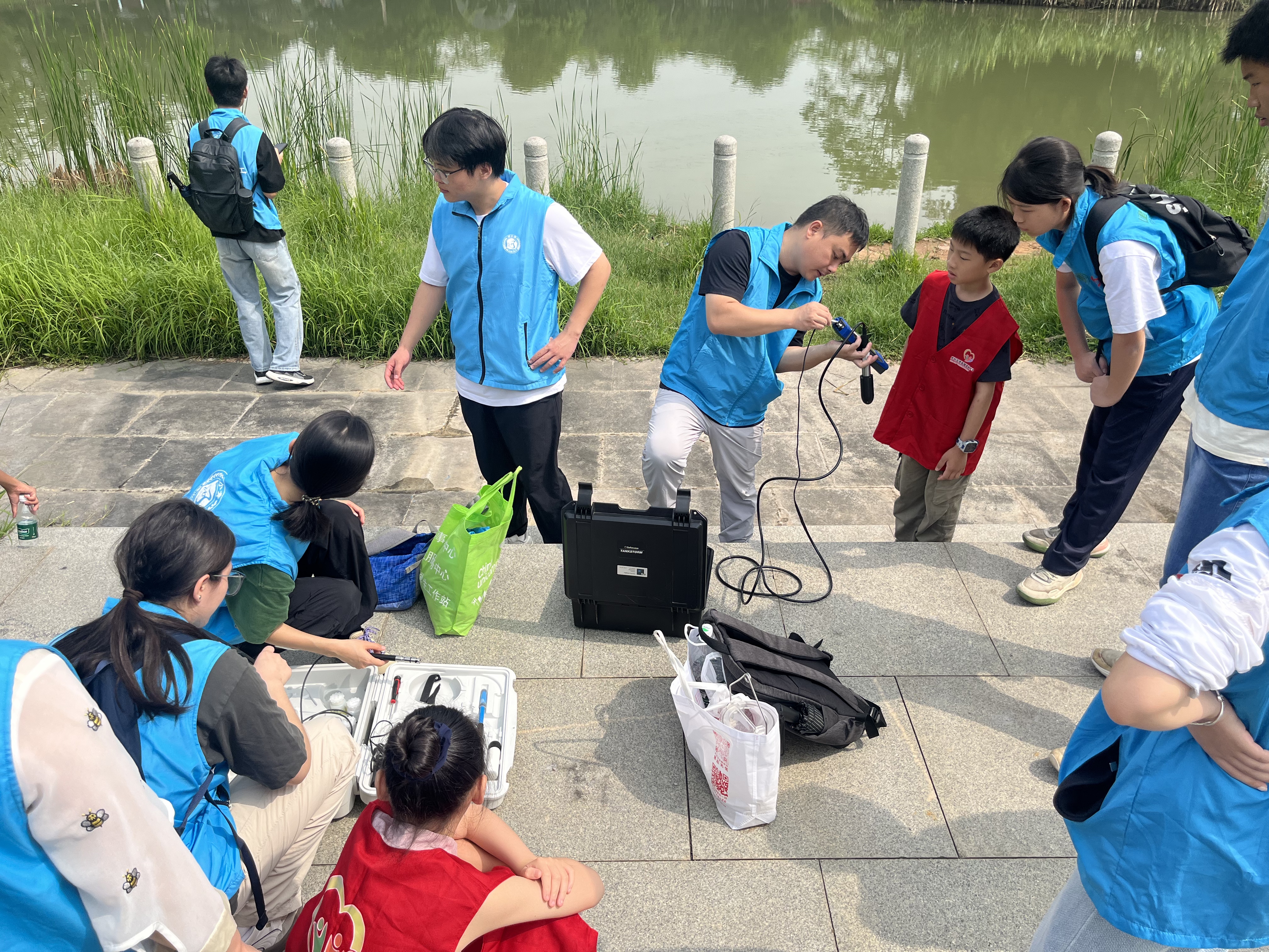 紧接着,志愿者们来到王借岗森林公园,化身“河流医生”开展巡河护河。佛山大学曾发明博士现场教学,带领志愿者在3个点位进行水体叶绿素含量检测,大学生志愿者手把手指导社区义工操作专业仪器。巡河途中,志愿者们还通过火山遗址的古老岩体,解锁地质演变与当地水系形成、营养状况等深层关联。