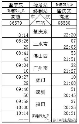 根据全国铁路新运行图,途经佛山西站、香港西九龙站的列车始发站为肇庆东站,车次为G6579/6580由“复兴号”担当运营。