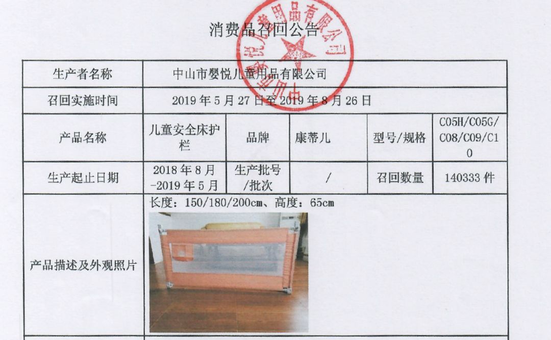 自2019年5月27日起,中山市婴悦儿童用品有限公司召回部分2018年8月至2019年5月期间制造的康蒂儿品牌儿童安全床护栏。型号包括C05H,C05G,C08,C09和C10,受影响的床护栏数量为140333件。