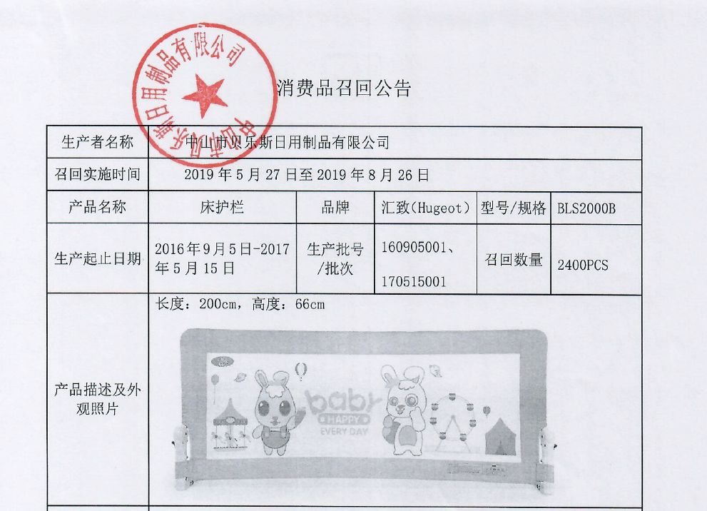 自2019年5月27日起,中山市贝乐斯日用制品有限公司召回部分2016年9月至2017年5月期间制造的汇致品牌BLS2000B型号的床护栏,受影响的床护栏数量为2400件。
