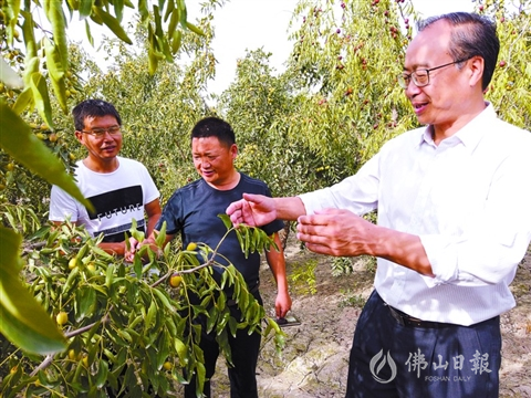 援疆干部徐平(右一)在草湖二连果园查看果园的生产情况。