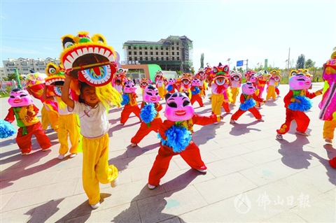 “把西樵最具特色且百姓喜闻乐见的岭南龙狮传统文化引入草湖。”这是来自佛山西樵镇的援疆干部麦志成定下的目标。在佛山市政府的支持下,经过工作队与西樵镇沟通协商,今年4月,草湖镇龙狮体育协会正式成立,由西樵龙狮武术运动协会派出的龙狮表演教练也抵达草湖。如今,位于大漠边疆的草湖镇已培训出一支具有岭南特色的龙狮队。