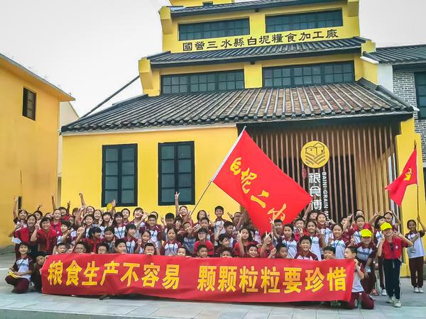 白坭镇第二小学开展研学游活动,在粮食博物馆前合影。/白坭镇供图